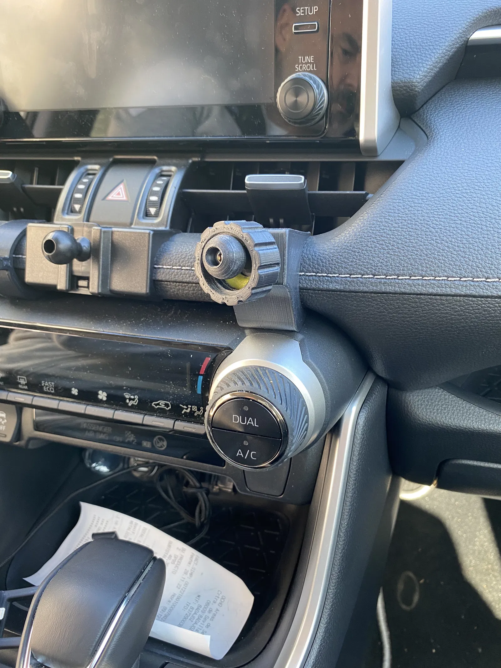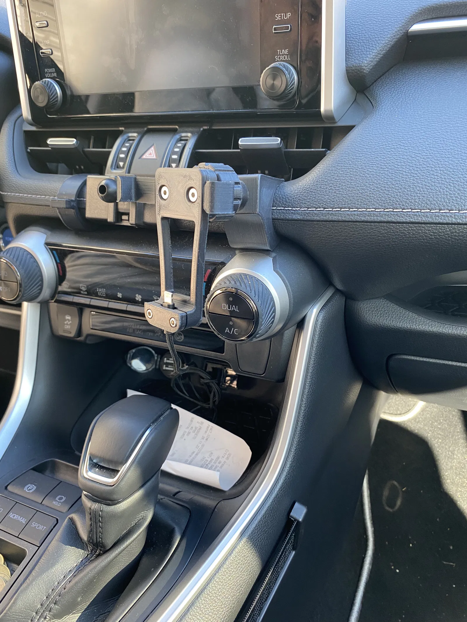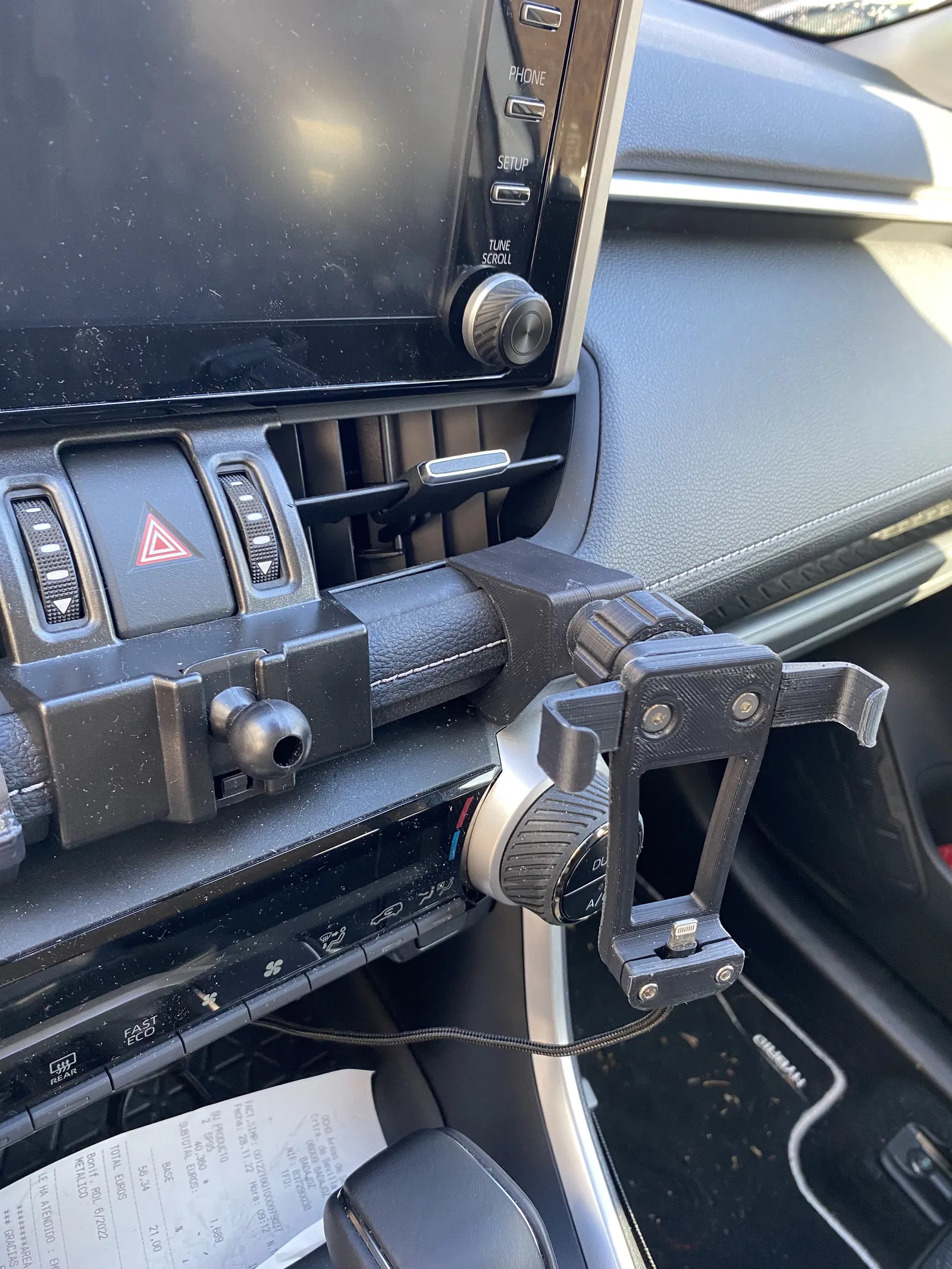 Giá đỡ điện thoại kiêm sạc xe hơi xài bi xoay 17mm, tương thích nhiều loại điện thoại. Có đế CD kèm theo. Gắn được trên xe Toyota Rav4. Có tùy chọn tay đỡ cố định hoặc điều chỉnh. Dùng ốc 3mm và 4mm. Khuyến khích in bằng ASA để chịu nhiệt.