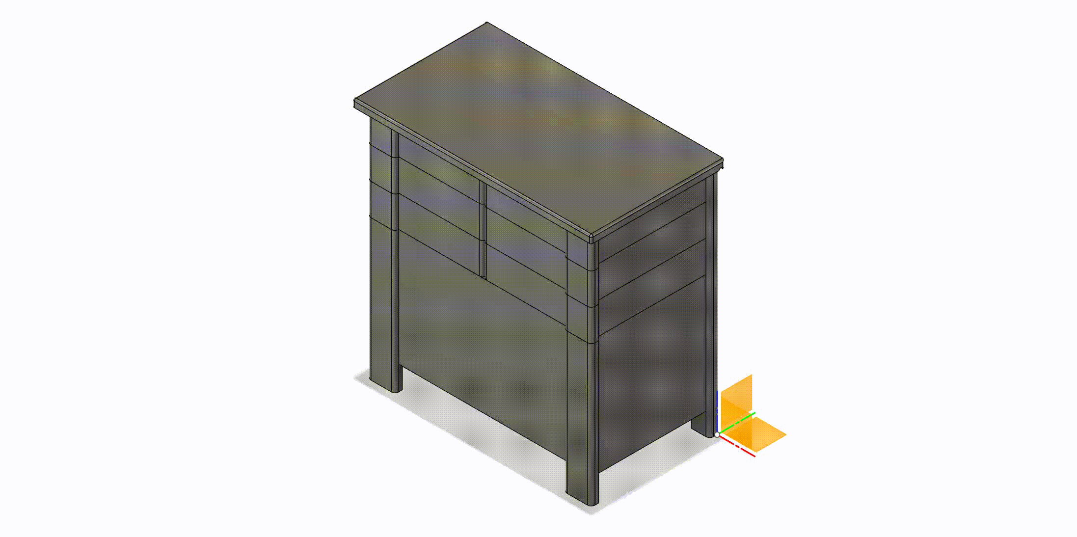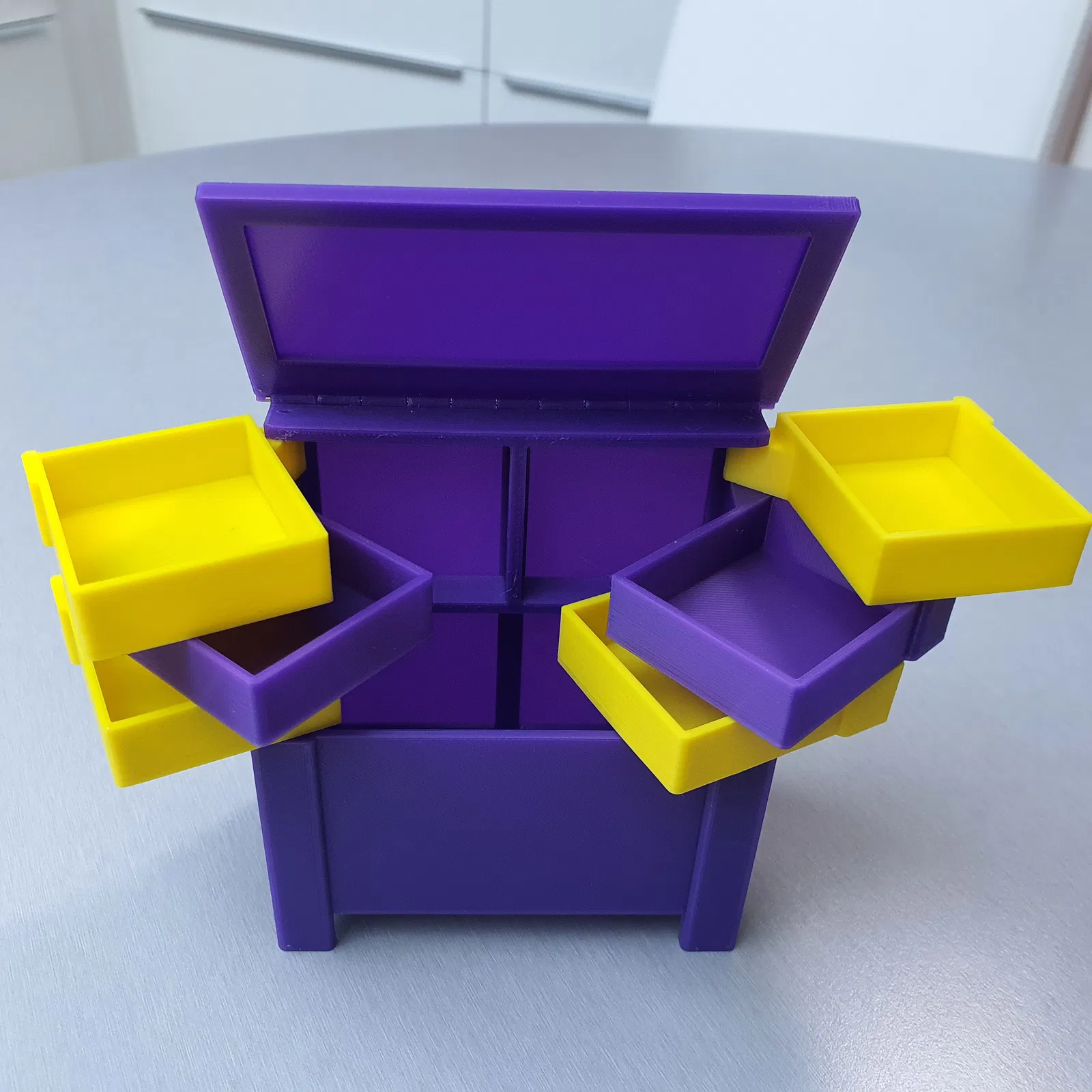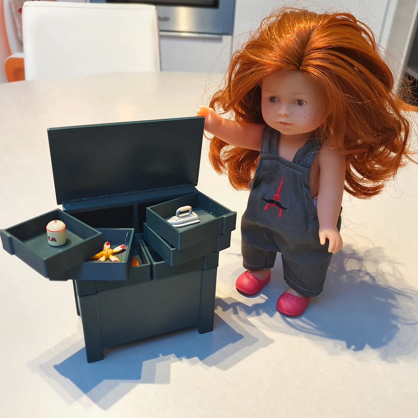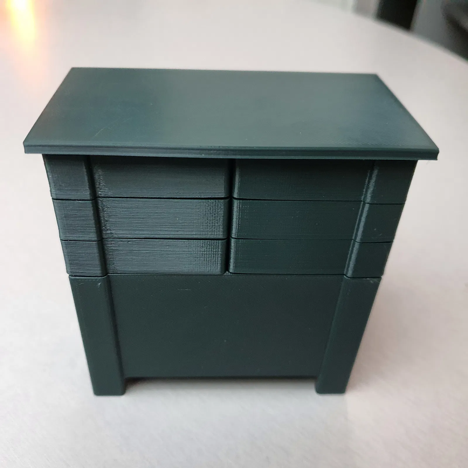 Tái hiện món đồ nội thất thợ may thập niên 50 thu nhỏ, bộ đồ chơi này bao gồm thân tủ, 6 ngăn kéo và 1 khay. Các ngăn kéo và khay đều mở được. Kích thước 10x9x5cm, in không cần support, điền 15%. Cần dây kim loại 0.9mm và keo cyanoacrylate để lắp ráp.