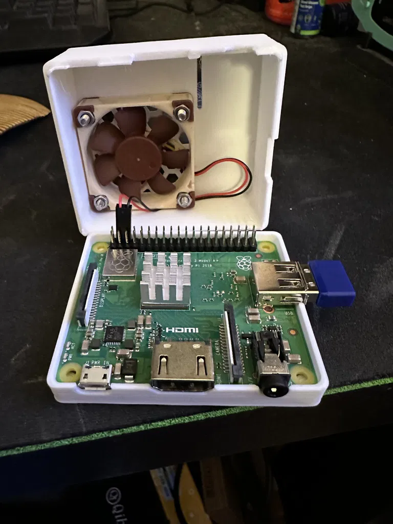 Tôi đã thêm một v2. Phiên bản đầu tiên được niêm phong quá chặt và có rất ít luồng không khí. Tôi nhầm tưởng sẽ có đủ giải phóng mặt bằng xung quanh tất cả các cổng IO để thở. Người hâm mộ cũng không tập trung và có thể dẫn đến sự can thiệp của GPIO, hiện có rất nhiều không gian cho các hoạt động. Tôi đã thêm một vỉ nướng lỗ thông hơi lớn trên cổng USB cho luồng không khí. Thiết kế này sẽ cho phép luồng không khí tối đa cho lớp xung 3 A+.