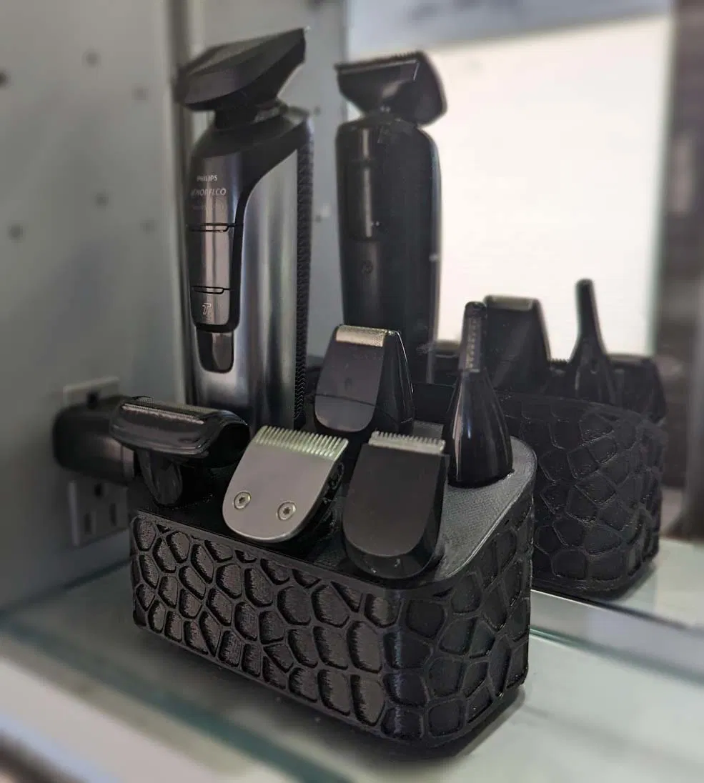 Tui làm một cái đế nhìn đẹp cho máy cạo râu của tui, sau khi chán ngán cái cảnh bộ phận máy cứ vung vãi lung tung. Tui in với mặt trên úp xuống để tránh bị hiệu ứng bậc thang ở phía trên.