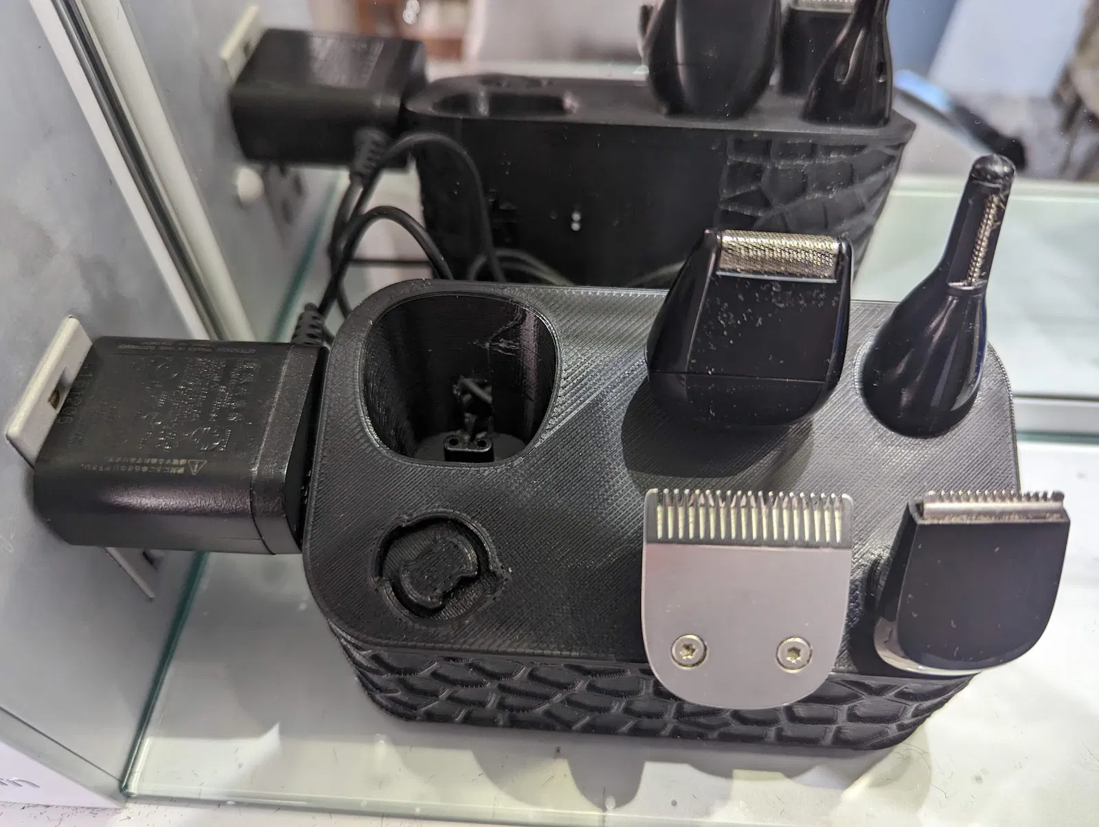 Chán cảnh bộ phận máy cạo râu vung vãi, tui đã tự làm một cái đế cạo râu vừa đẹp vừa tiện lợi. Lưu ý: Tui không khuyến khích sạc máy qua đế này vì có thể làm hỏng dây. Đế này chỉ vừa với máy QG3398 (7500 Multigroomer).