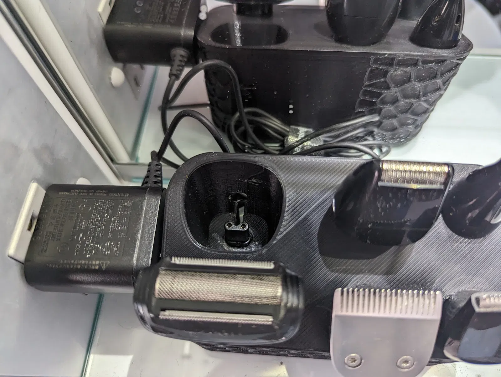 Tui cũng tính làm sao cho cái đế này có thể sạc cho máy cạo râu luôn, nhưng mà phần đó làm không được thành công lắm. Tui phải gọt bớt nhựa ở phần dây cáp để nó vừa, rồi tạo một cái góc uốn cong sát, và cái góc uốn cong đó sau đó đã làm đứt dây cáp. Nên tui không khuyến khích mọi người thử nhét dây sạc vào đó.