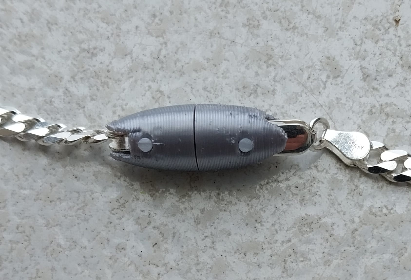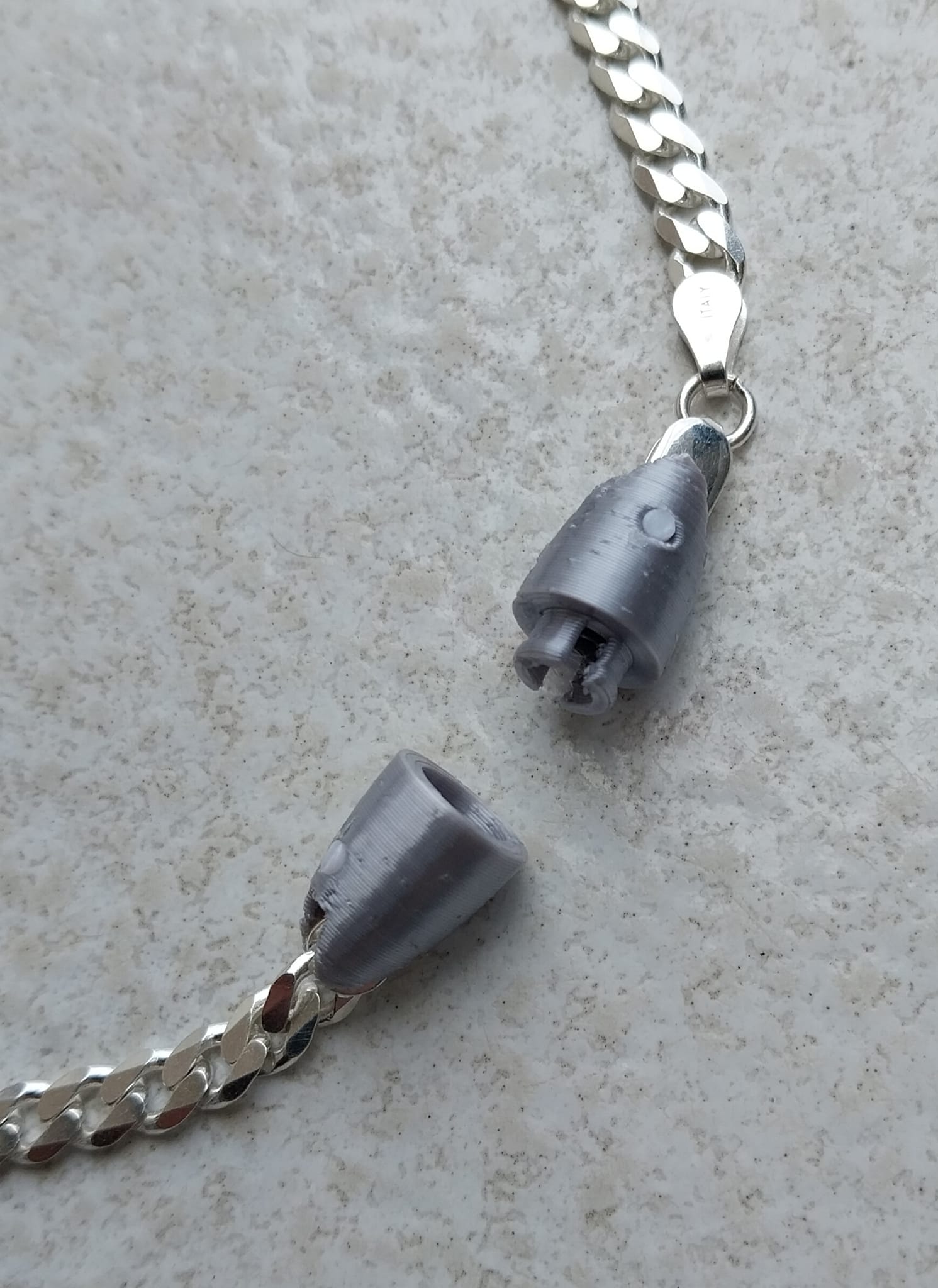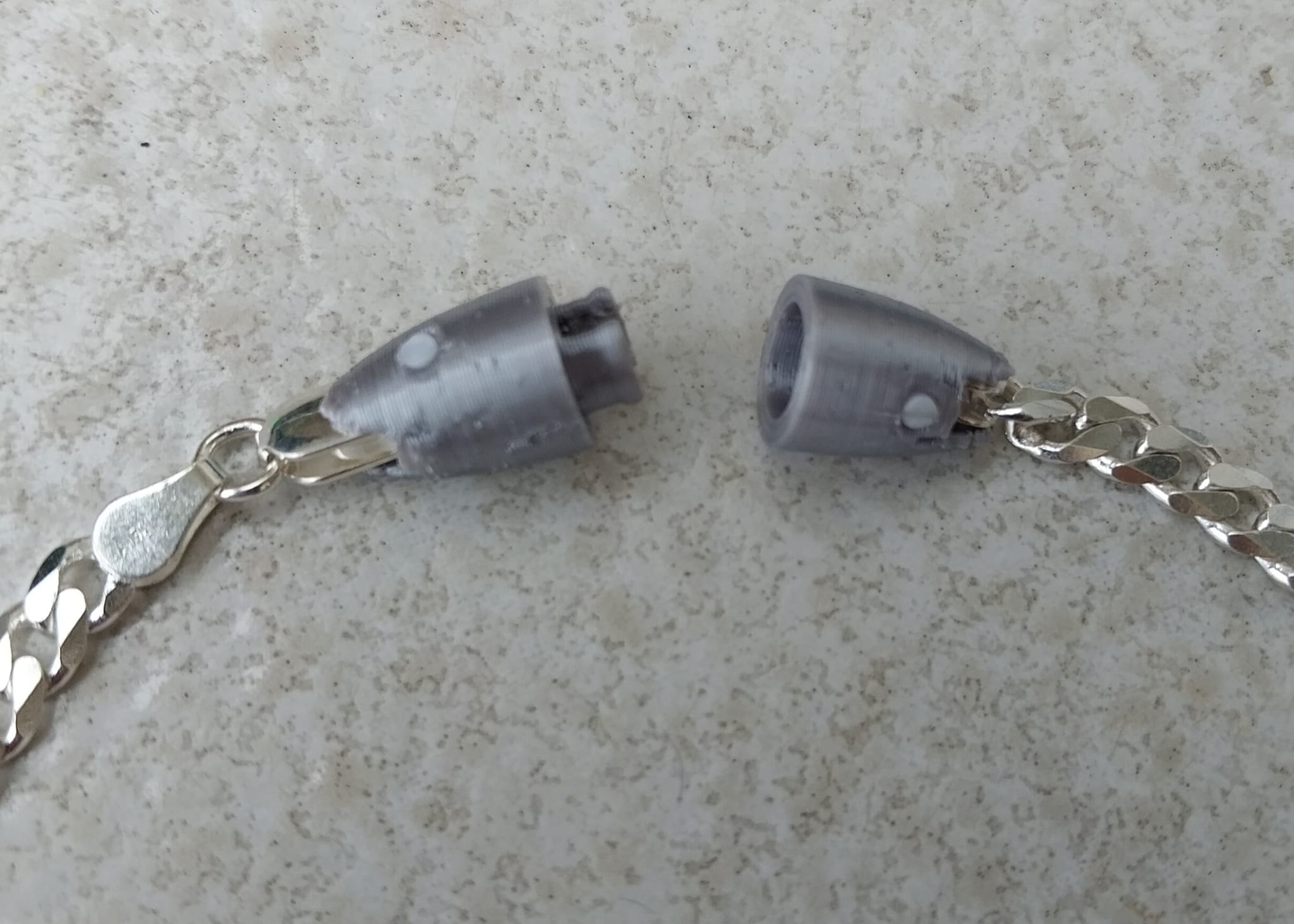 Đây là một đầu nối thùng tôi đã làm để tôi có thể đeo chuỗi kim loại mà tôi đi đến Giáng sinh an toàn tại nơi làm việc (tôi làm việc trong chăm sóc người già Dementia). Nó sử dụng một mảnh dây tóc để giữ các đầu của chuỗi tại chỗ sau khi chèn chúng vào đầu của hai mảnh đầu nối. Thưởng thức!