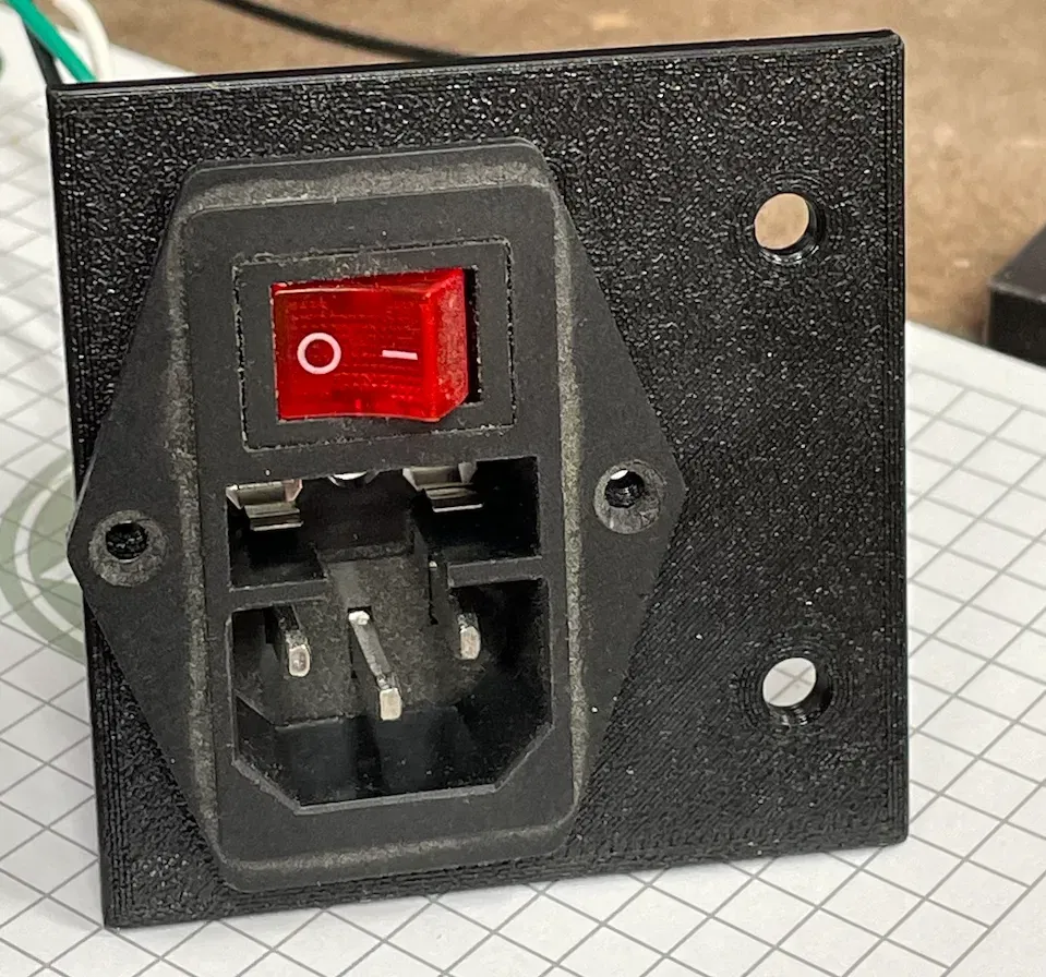 Một giá đỡ nguồn đơn giản cho các đầu vào điện 110v bán tiêu chuẩn có sẵn trên Amazon. Gắn trên thanh nhôm 2020. Bất kỳ loại filament nào cũng được, tôi đã sử dụng ABS, 40% độ đặc.