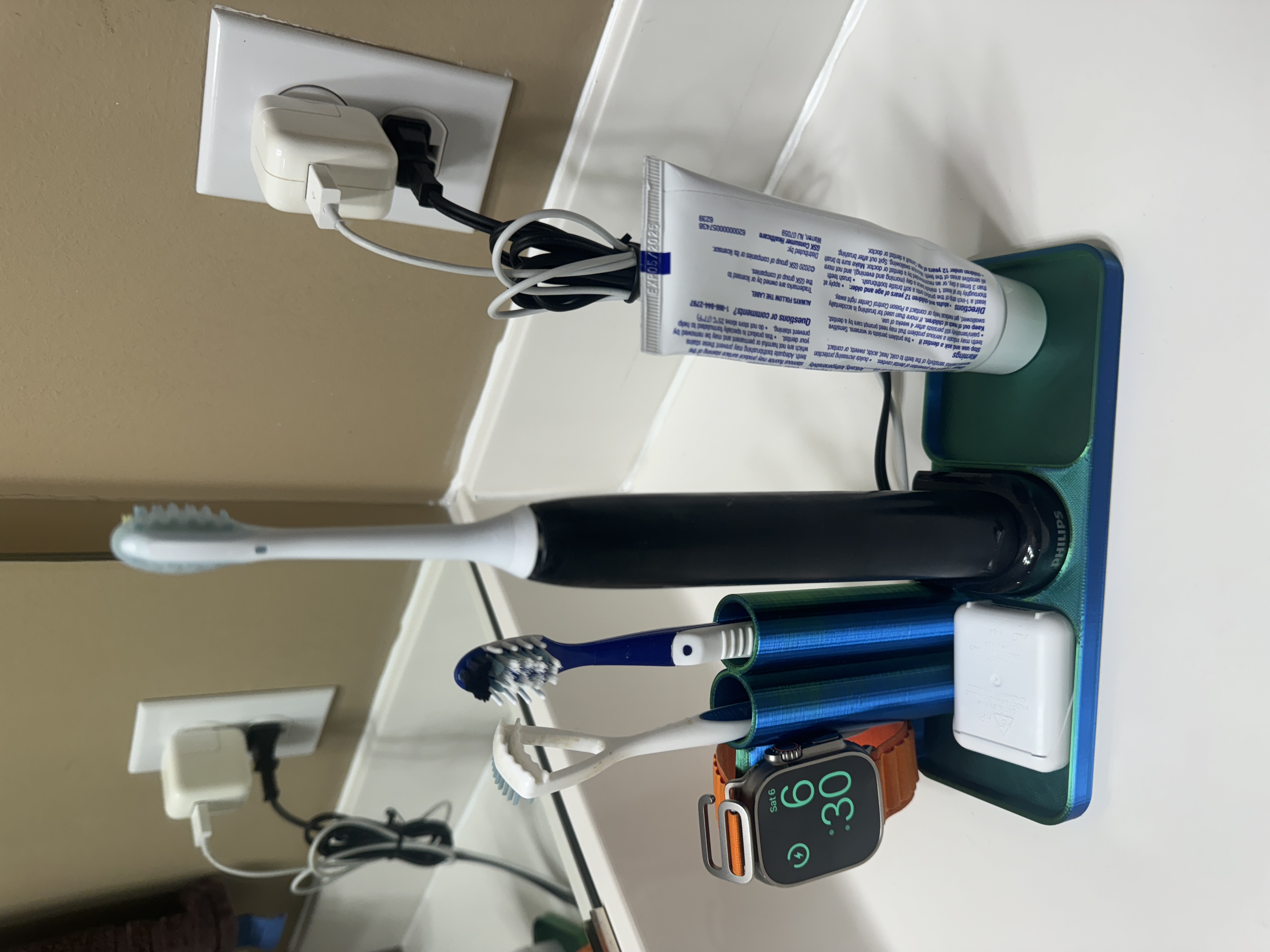 Kệ đựng bàn chải đánh răng điện Philips, kèm các loại bàn chải đánh răng thông thường (có lỗ thoát nước dưới đáy), kem đánh răng và chỉ nha khoa. Có một phiên bản có đế gắn sạc Apple Watch tùy chọn, vì tui hay tháo đồng hồ ra khi tắm.