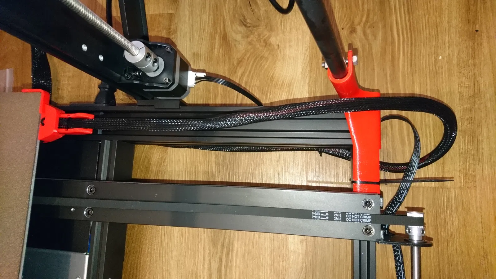 Tui thấy cái dây cáp cho bàn in lúc nào cũng chạy giữa khung máy và cái thanh ngang phía trên. Sớm muộn gì cái vỏ bảo vệ và dây cáp cũng bị hư hoặc cạ vào bàn in khi di chuyển. Cái dây xích năng lượng (energy chain) thì lại quá dài ở phía sau, tui không có chỗ để gắn. Nên tui đã thiết kế cái bộ làm lệch hướng màu đỏ này. Nhìn nó có hình dáng hơi lạ, nhưng mà nó làm đúng chức năng của nó. Tui gắn nó vào thanh ngang bằng một con ốc M5x25 và đai ốc M5, còn phía khung máy thì tui dùng dây rút nhựa để cố định cho chắc ăn, phòng trường hợp cái bộ làm lệch hướng này nó va chạm với mấy cái bánh xe của bàn in. Biết đâu có ai đó cũng cần xài cái món này ha :-) Chúc mọi người vui vẻ. Cái này cũng có thể dùng được khi bạn gắn thêm bộ phận này trên máy “Anycubic Kobra 2 Max” của mình: