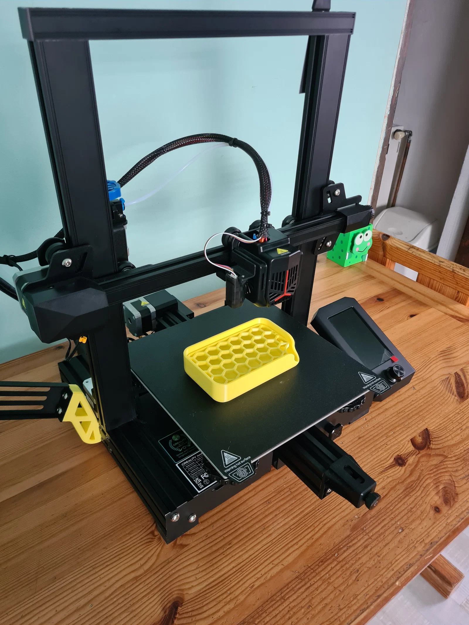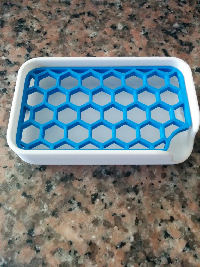 Giá đỡ xà bông dạng tổ ong, in bằng PLA, gồm hai mảnh có thể tháo rời, tiện lợi cho việc vệ sinh và sử dụng trong phòng tắm.