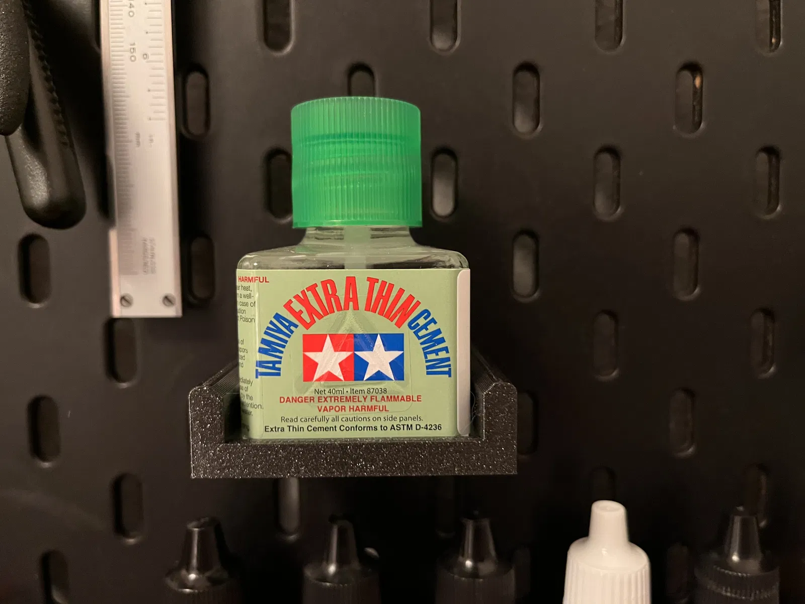 Một giá đỡ cho chai xi măng nhựa Tamiya. Phù hợp với hệ thống skadis/skådis của bảng điều khiển. Cho phép hỗ trợ để làm cho chúng sạch sẽ.