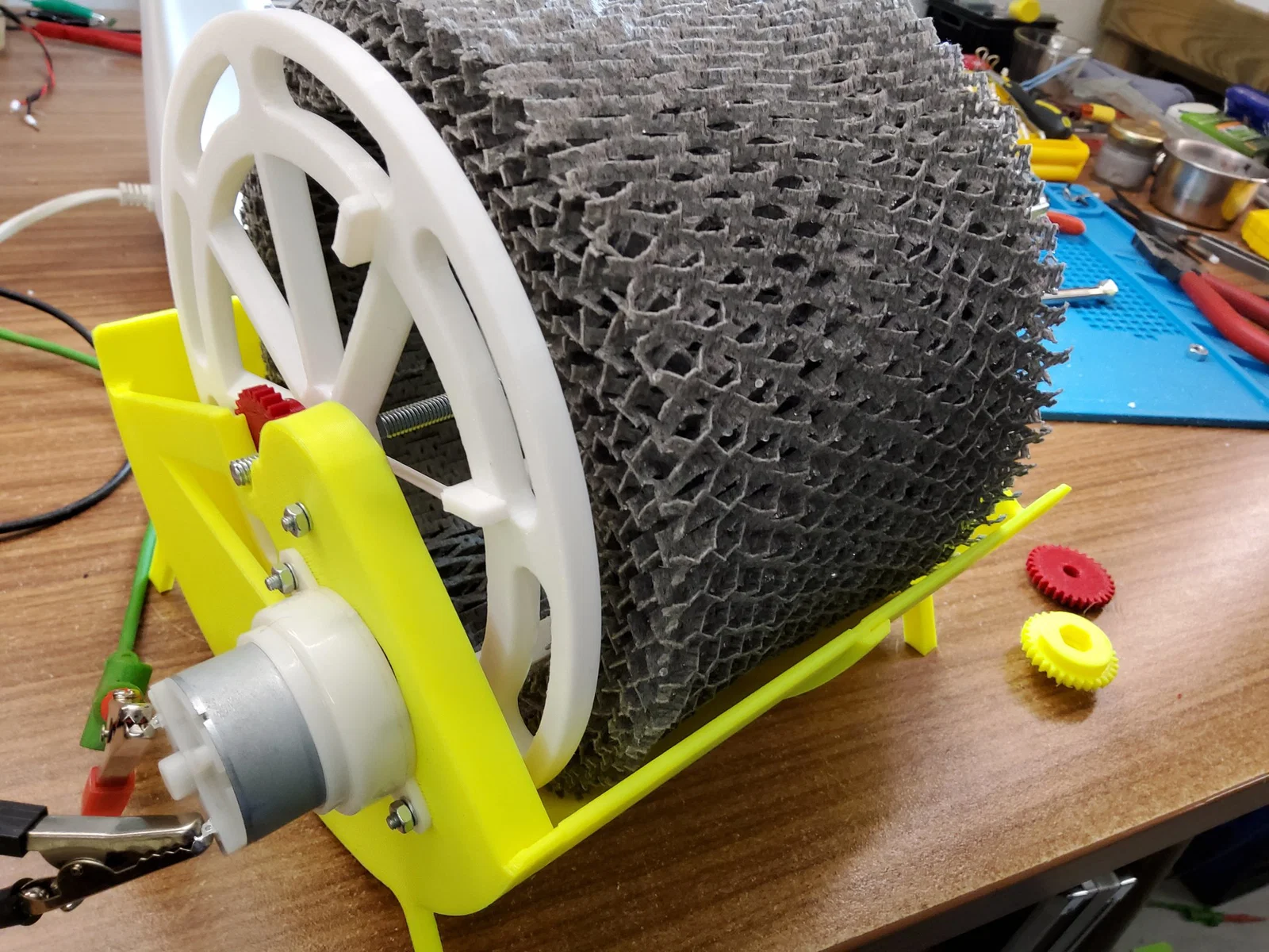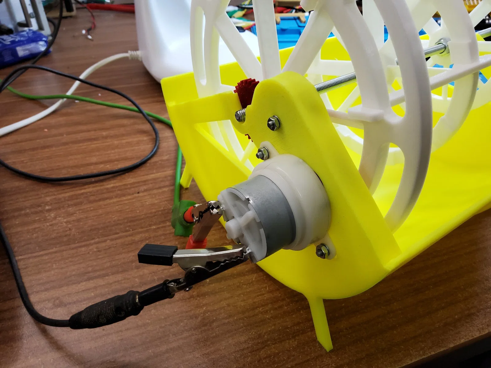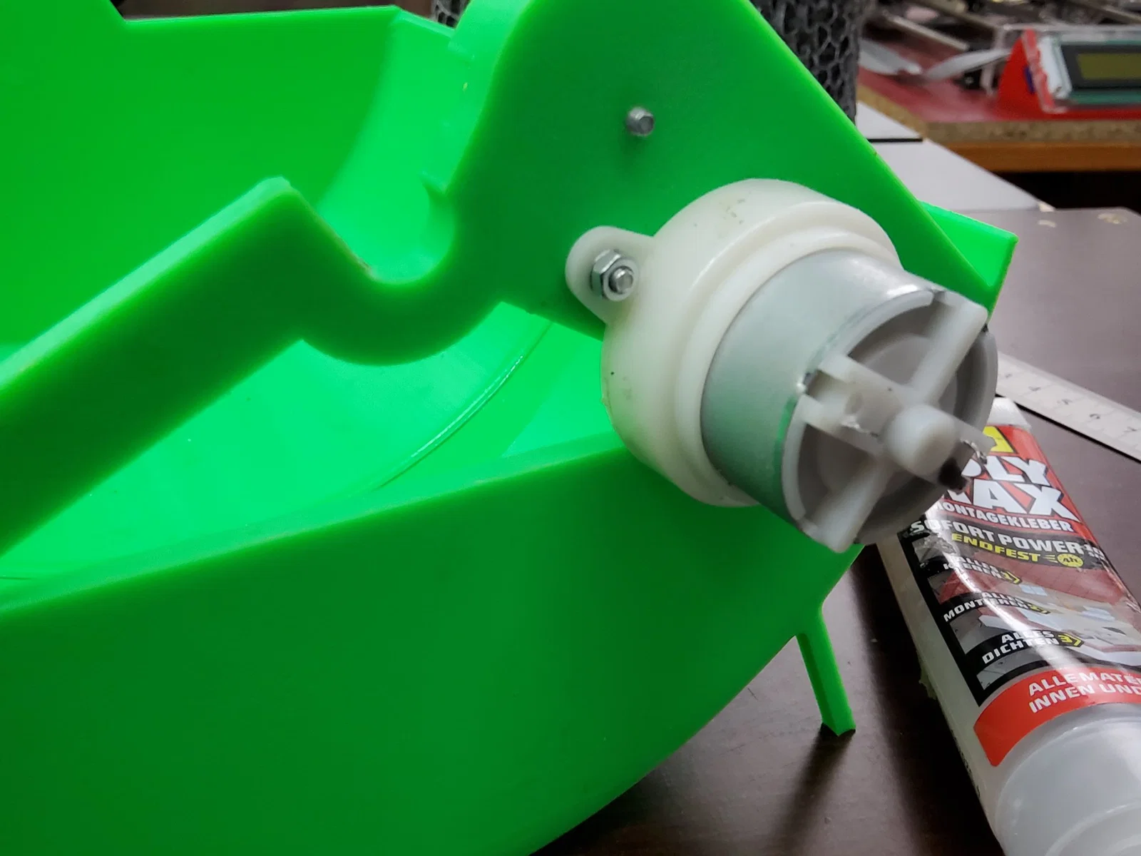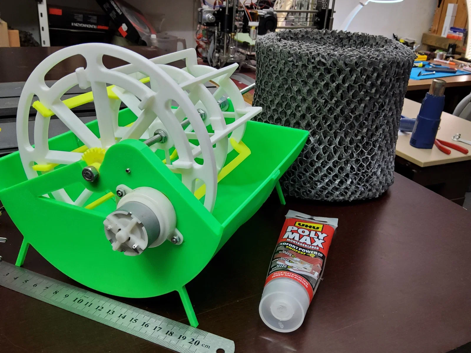 Vì tôi không thực sự kiểm soát được độ kín, tôi đã bôi bên trong bồn bằng cái này (Cảnh báo quảng cáo!!! Chắc chắn cũng có từ các nhà sản xuất khác) UHU Poly MAX và cũng dán hai nửa lại với nhau bằng nó. Động cơ có 12V và 6 vòng/phút. Sử dụng bộ nguồn 12V hoặc một bộ điều khiển StepUp cho 5V (bộ nguồn USB) lên 12V. Sau đó, điều này cũng có thể thực hiện với ví dụ như Micro USB v.v.