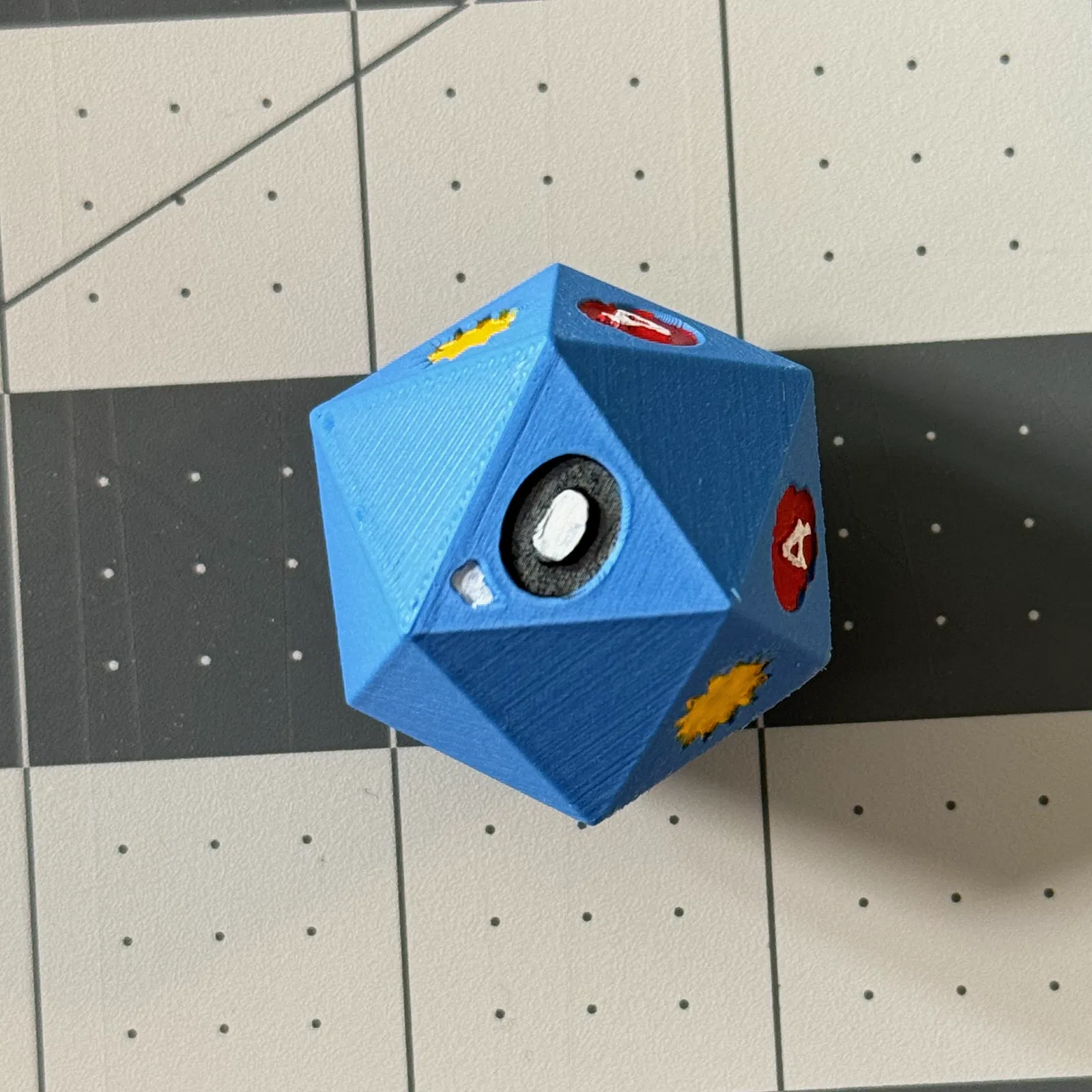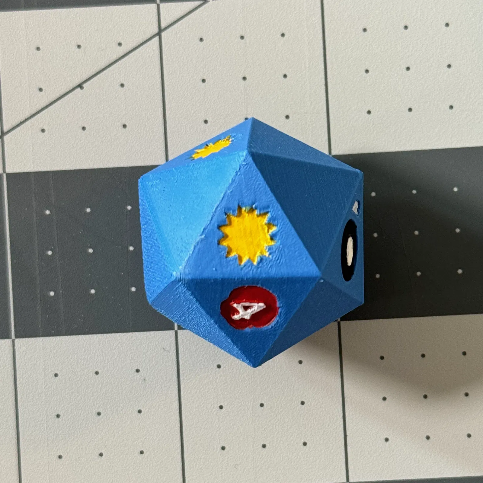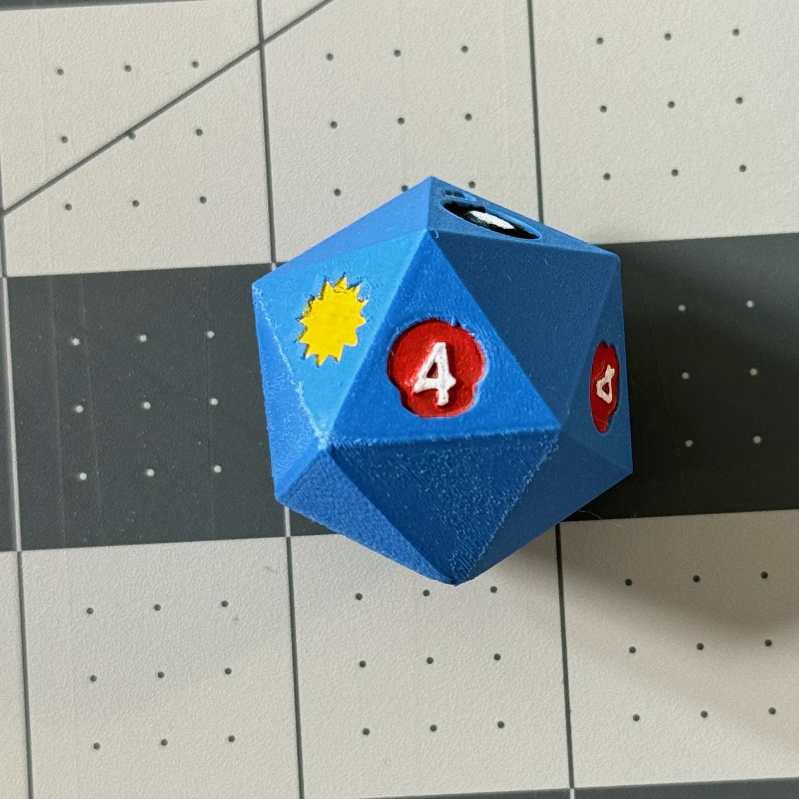 Tôi đã thiết kế con d20 tùy chỉnh này để sử dụng cho các lượt tung xúc xắc này nhằm duy trì tốc độ chơi, hạn chế việc kiểm tra sách luật và đưa ra phản ứng tức thì hơn với kết quả. Con xúc xắc này được thiết kế để hỗ trợ luật chơi cho người mới bắt đầu, vì vậy có một mặt dành cho khởi đầu tệ, bốn mặt dành cho khởi đầu tốt và bốn mặt dành cho va chạm. Kết quả khởi động bị bỏ qua trong quá trình kiểm tra va chạm, và kết quả va chạm bị bỏ qua trong quá trình kiểm tra khởi động.