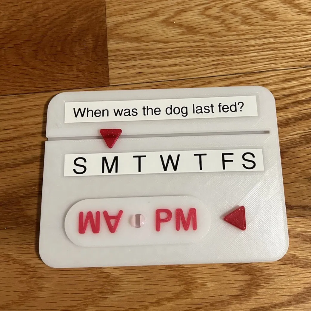 Ban đầu, tôi thiết kế cái này để giúp tôi và vợ nhớ và báo cho nhau biết lần cuối cho con chó ăn lúc nào, để chúng tôi không cho nó ăn quá nhiều (vâng, tôi biết nó dễ thương). Tuy nhiên, tôi nhận ra rằng cái này có thể tuyệt vời để nhắc nhở uống thuốc hoặc các công việc định kỳ khác.