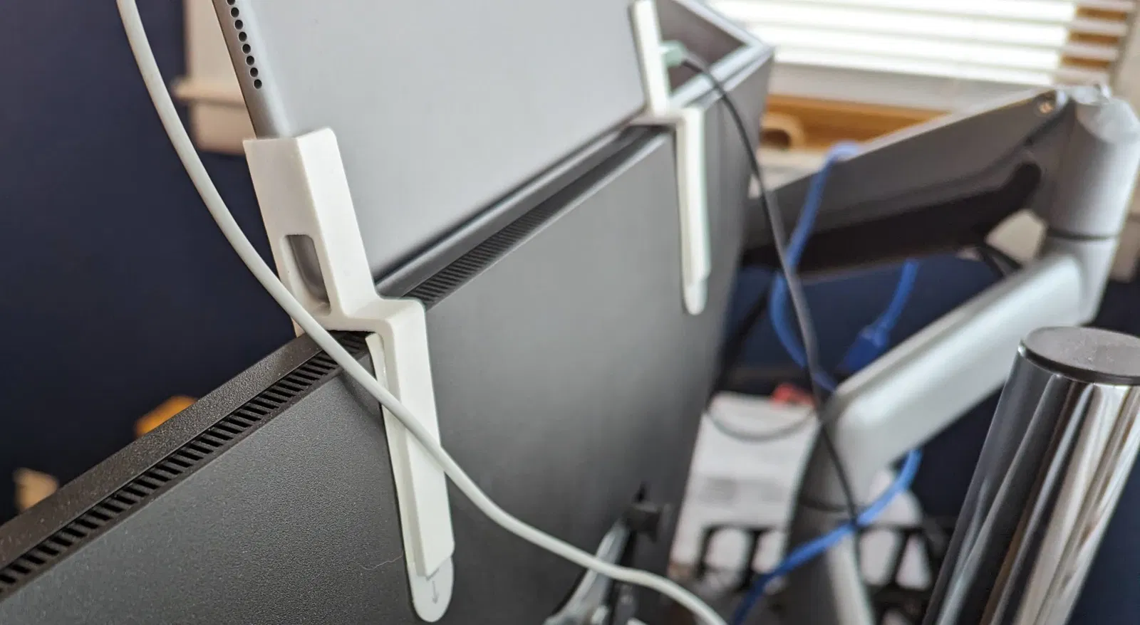 Tôi muốn nó là một giá đỡ gọn gàng hơn, với độ bám chắc hơn. Tôi đã thêm một lỗ để cho phép giắc cắm tai nghe đi qua. Bạn chỉ cần in một cái và phản chiếu nó cho mặt còn lại. Những cái này vừa với màn hình Dell mới của tôi. Tôi đã thêm một tệp Step để bạn có thể chỉnh sửa nếu cần để phù hợp với màn hình của mình. Tôi sử dụng băng dính 3m Command Strips để gắn chúng vào màn hình. Tôi đã gắn iPad theo cách này hơn một năm nay rồi. Chúng cũng không làm hỏng màn hình của bạn khi bạn tháo chúng ra.