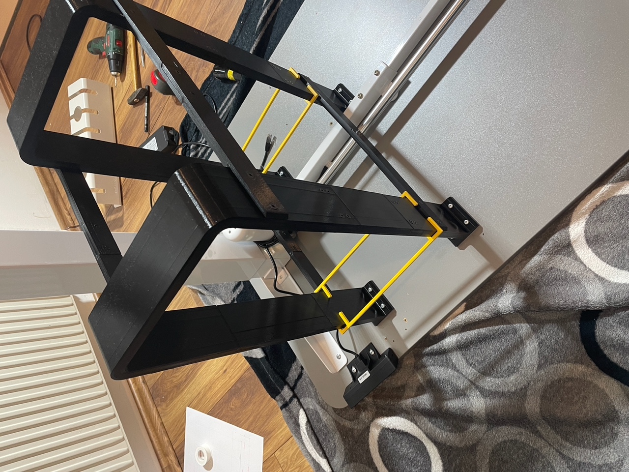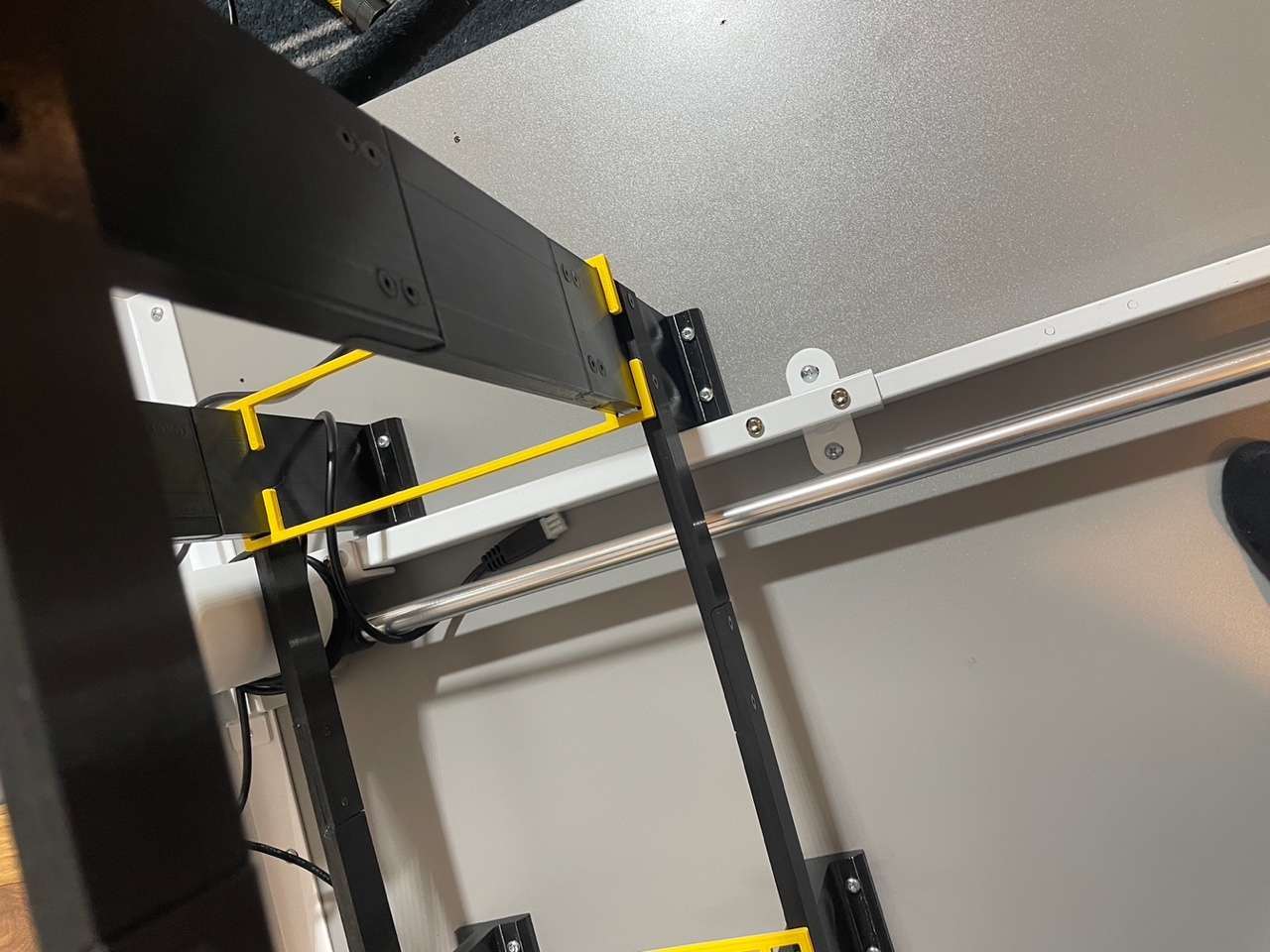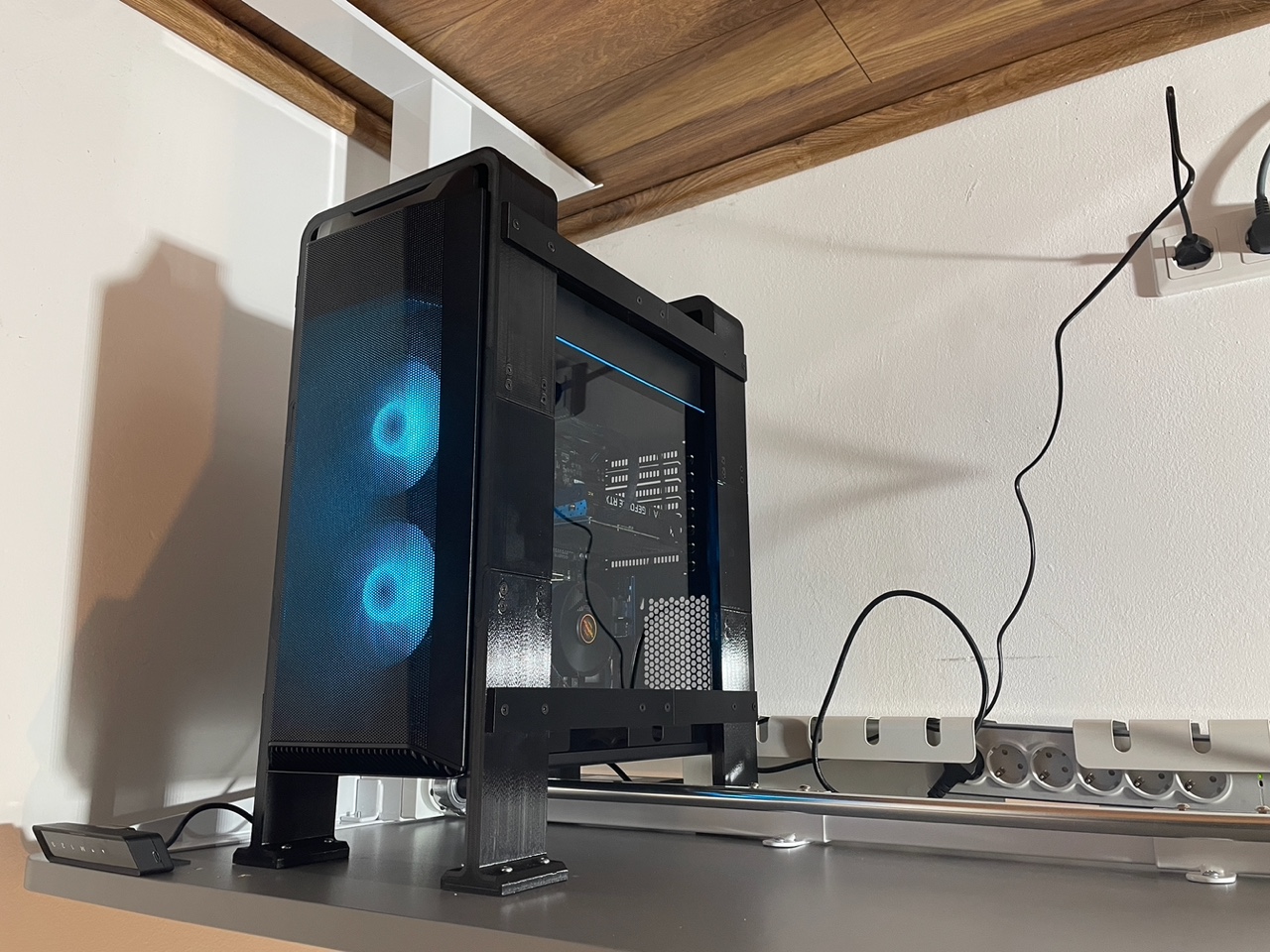 Làm giá đỡ PC dưới bàn để bàn làm việc nâng hạ, kích thước PC 20.5x46.5x41 cm, giá đỡ có không gian 21x52.3x41 cm. Dùng ống ren đồng M4 và ốc chìm. Vật liệu PETG, in trên Prusa MK3S+. Tốn 2.7kg nhựa.