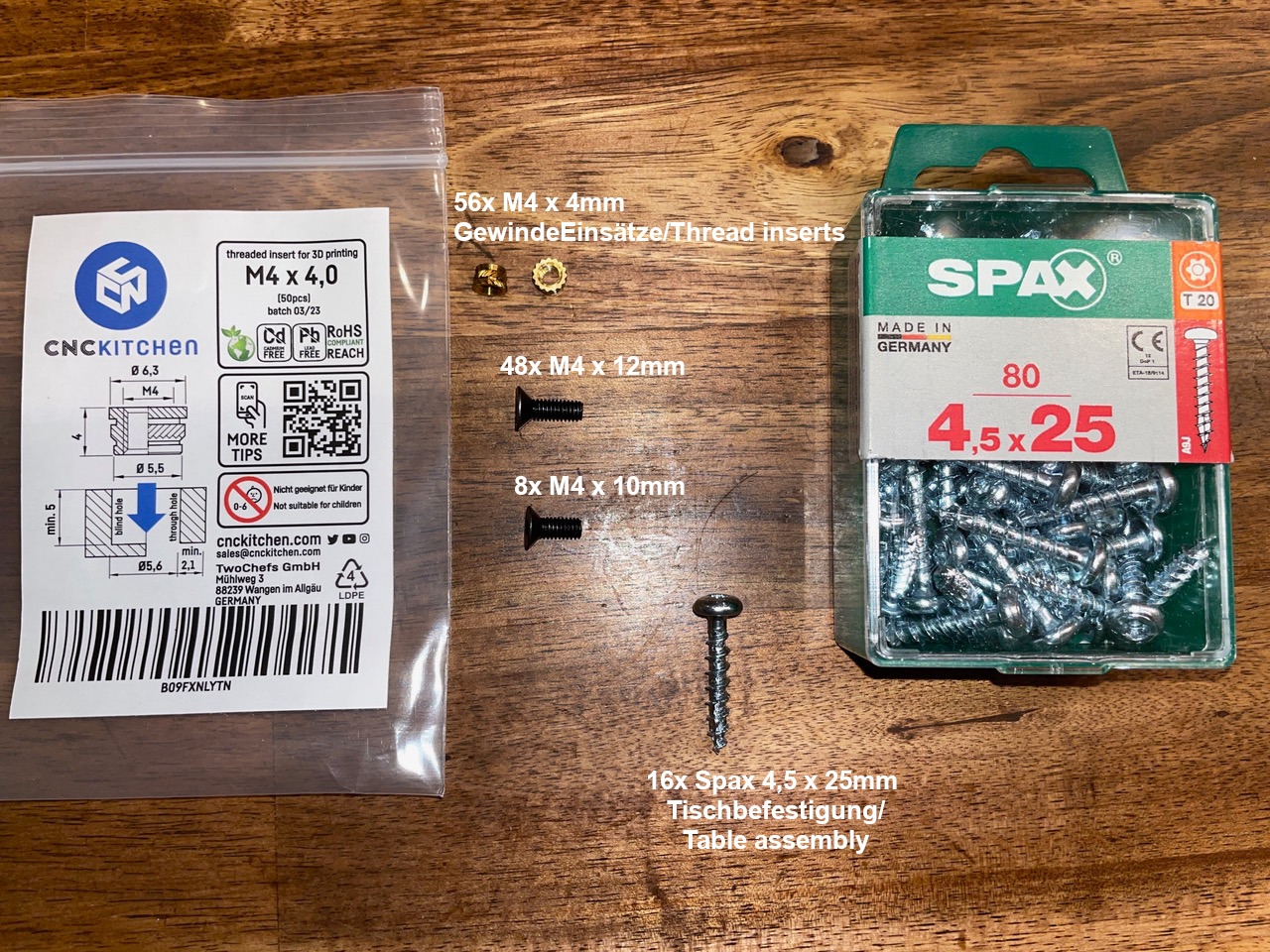 Cần mấy món sau đây: 56 cái ống ren M4 x 4mm - Tui xài loại của CNC-Kitchen á... mua ở 3DJack Shop nha - hoặc mua đại trên Amazon cũng được... 48 cái ốc chìm M4 x 12mm - Tui mua trên Amazon nè 8 cái ốc chìm M4 x 10mm cho mấy thanh ngang ở giữa - Tui mua trên Amazon nè
