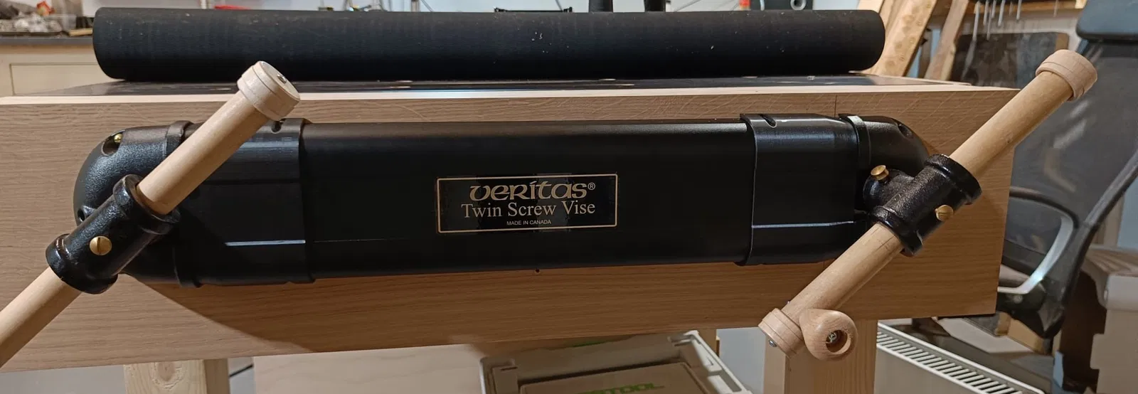 Chào mọi người, tôi vừa mới đóng cho mình một cái bàn làm việc bằng gỗ mới và cái giá của cái Kẹp Veritas đã khá là cao rồi, nên tôi không muốn bỏ thêm 40 đô la cho cái nắp kim loại và dây xích dài hơn.