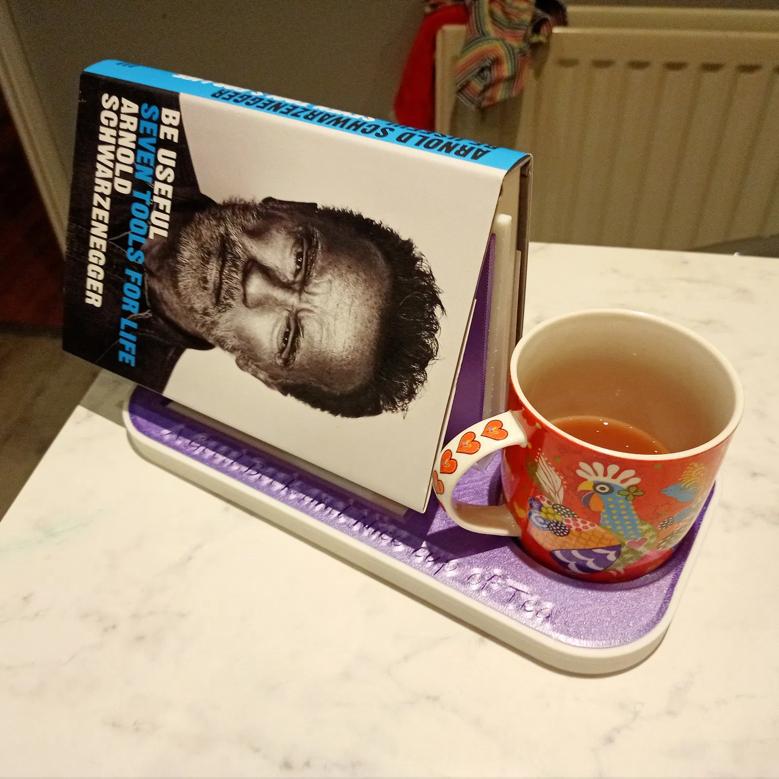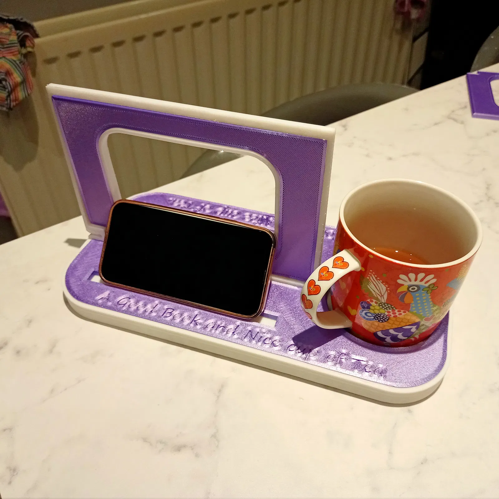 Kệ để giữ trang sách, đựng ly trà và đặt điện thoại. Thiết kế cho người thích đọc sách và uống trà, có thêm kẹp sạc tiện lợi, dễ in, không cần support. Dùng PLA lụa màu tùy thích.