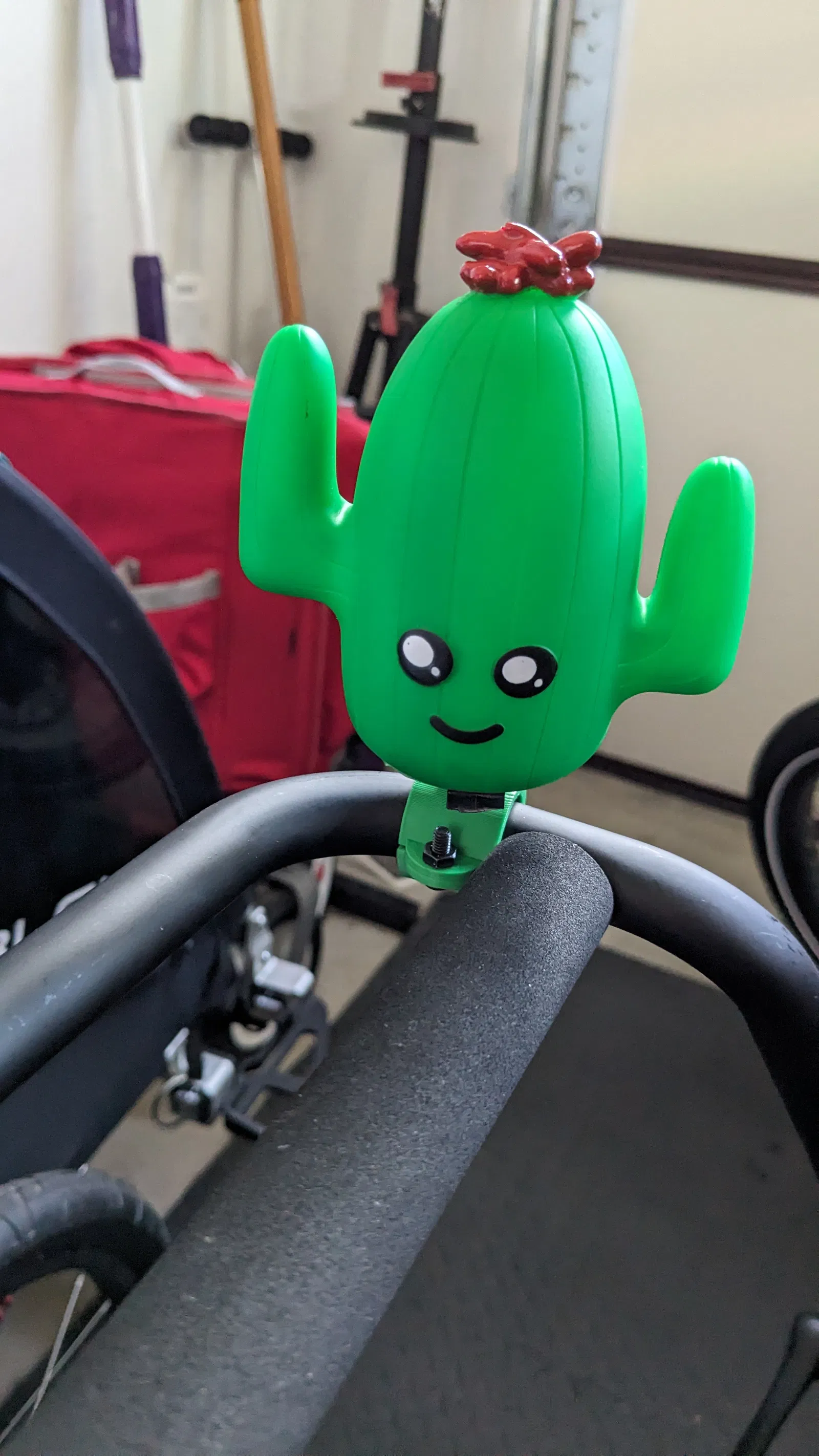 Mình mua cái kèn xe đạp hình xương rồng (cactus) ở REI cho thằng nhỏ, mà cái ngàm gắn nó bị gãy. Vì ốc với vít vẫn còn xài ngon, nên mình chế cái ngàm để gắn cái kèn vô yên sau xe đạp chở con (Aventon Abound) nhà mình.