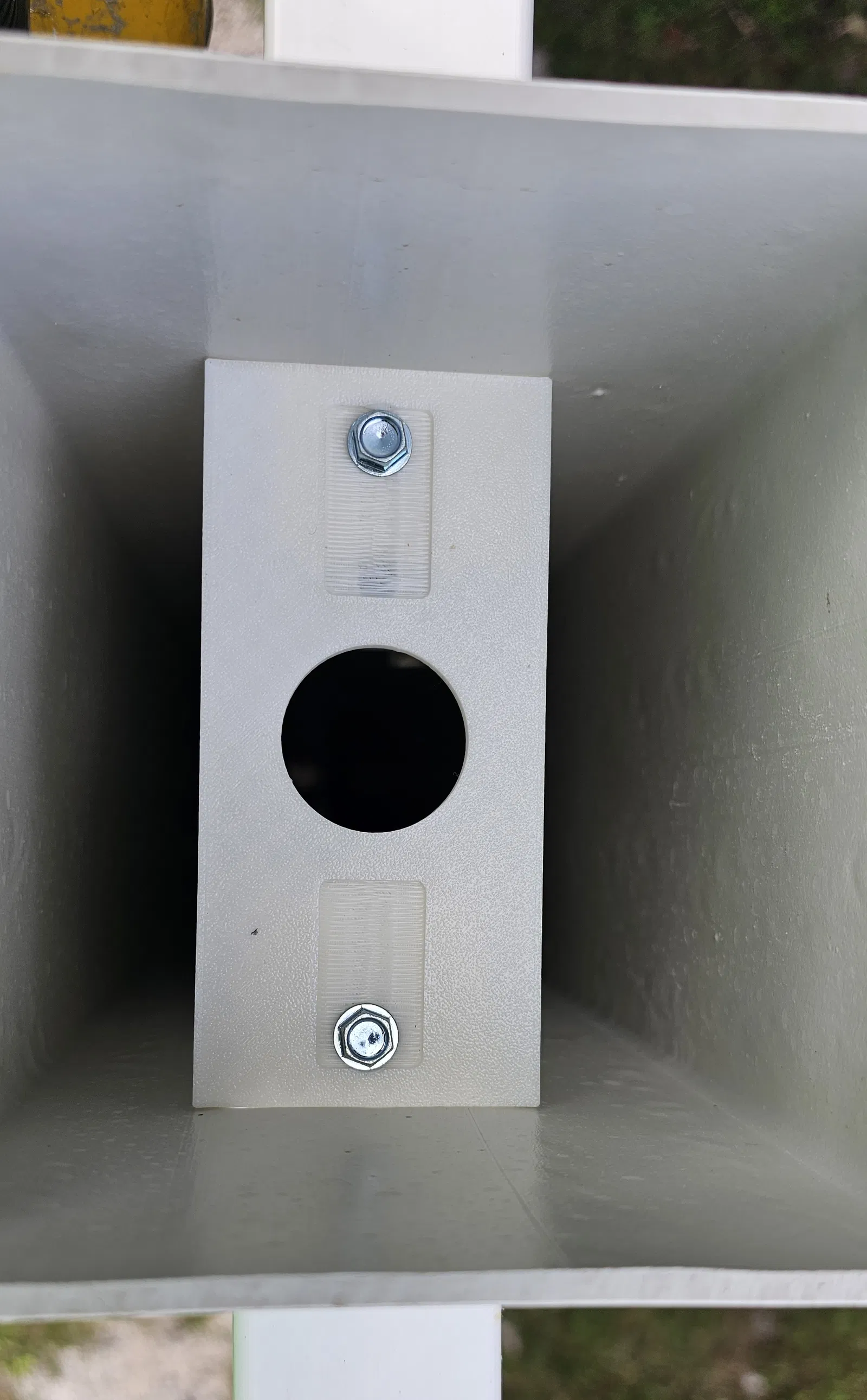 (Dành cho Cột Hàng Rào Vinyl 5”) Gắn cái tie này vào bên trong cột sau khi đã lắp thanh ray để tăng cường độ cứng và sự bền bỉ cho hệ thống cột và thanh ray. Cái này sẽ giúp ngăn thanh ray bị bật ra khi có gió lớn. Tôi gắn bằng vít tự khoan 2 inch loại #12. Thiết kế có một cái rãnh để tùy chỉnh vị trí vít và một lớp mỏng để vít có thể xuyên qua trước khi đi vào thanh ray.