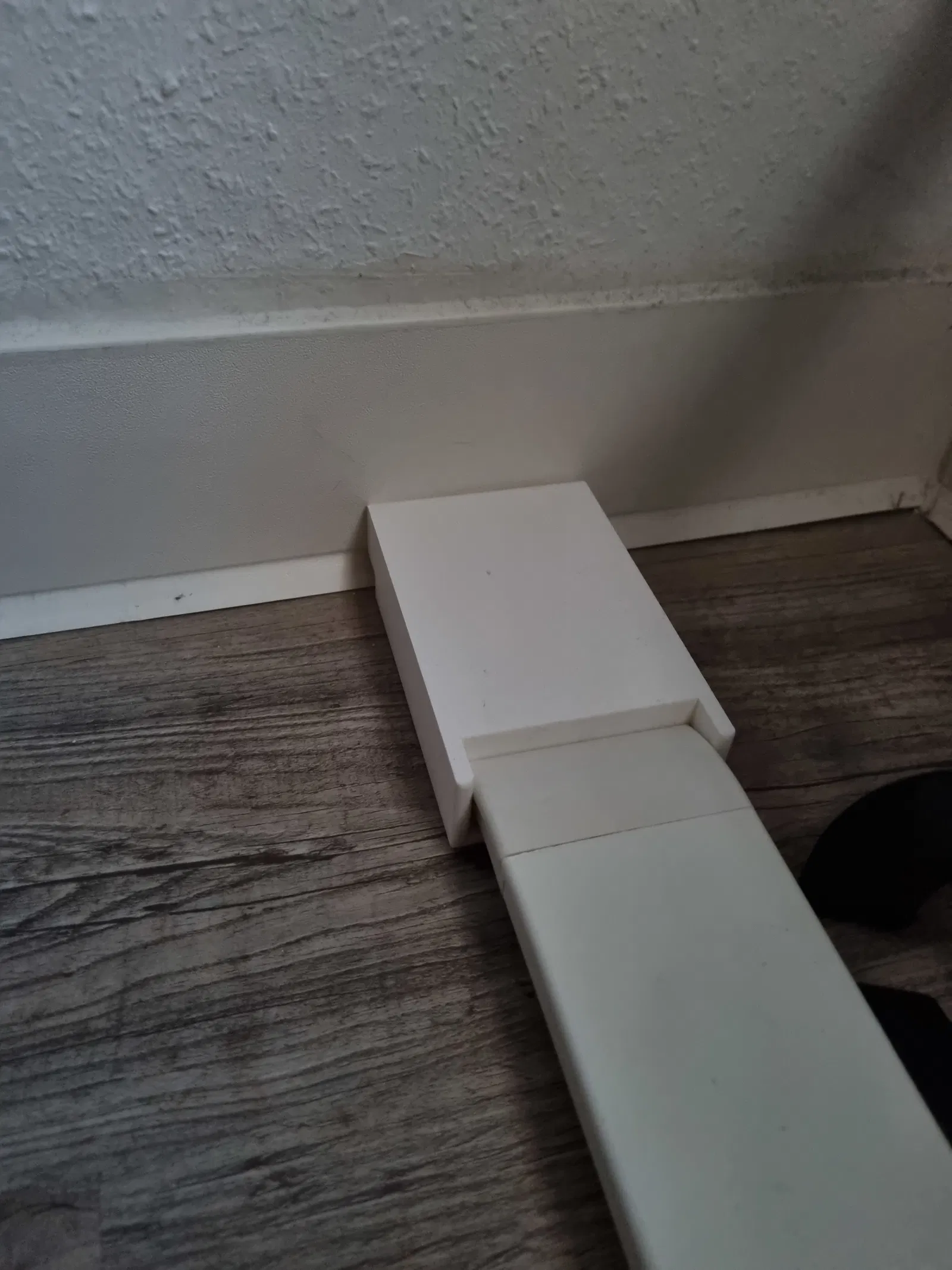 Cái bàn bị trượt trên sàn cứng và có thể làm trầy tường nếu nó quá sát tường. Miếng đệm này giữ một khoảng cách ổn định với tường. Nó có phần lõm cho các cái nẹp chân tường nhỏ. (15x10mm). Khuyến nghị in: Thêm giá đỡ bên dưới phần lõm, độ đặc 10% vẫn đủ chắc chắn.