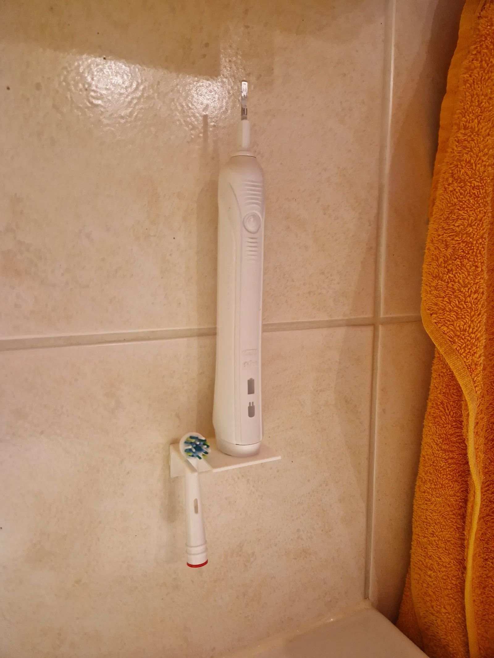 Kệ đựng bàn chải đánh răng đơn giản cho bàn chải điện Oral-B, dễ in và có thể dán lên tường. Giá đỡ này giữ bàn chải và một đầu bàn chải dự phòng chắc chắn nhưng vẫn dễ lấy.