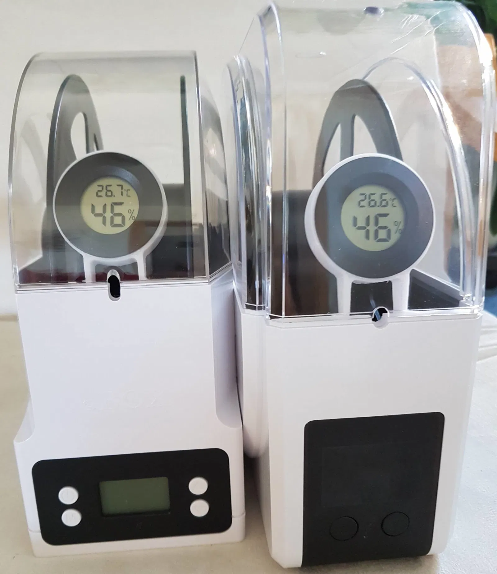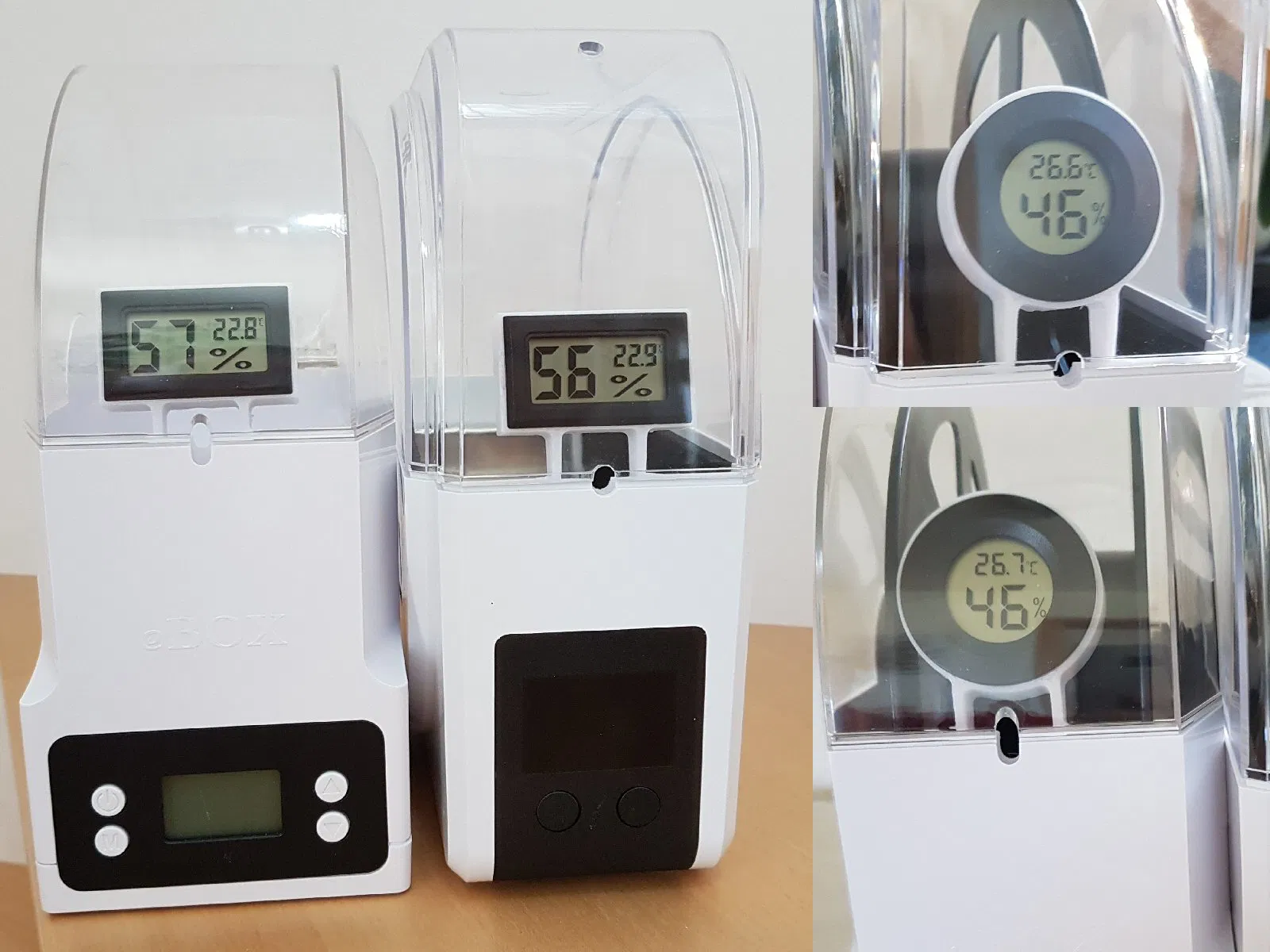 Cả Sunlu S1 và eSun eBox đều không có sẵn đồng hồ đo độ ẩm tích hợp. Nhưng có những loại đồng hồ đo độ ẩm/nhiệt độ kỹ thuật số mini giá rẻ có bán ở nhiều cửa hàng, cho phép bạn dễ dàng tự lắp đặt một cái.
