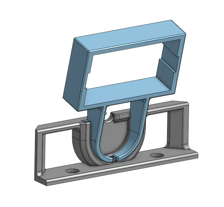Giá đỡ đồng hồ được nghiêng vài độ để dễ dàng mở nắp. Và cánh tay để gắn nó vào đế gắn có một khoảng trống ở dưới đủ rộng cho sợi nhựa đi qua. Như vậy, đồng hồ đo độ ẩm có thể được gắn hoặc tháo ra bất cứ lúc nào, ngay cả trong quá trình in. Điều này đặc biệt hữu ích cho phiên bản eBox, vì không gian hạn chế dưới nắp tròn, các cuộn sợi nhựa đầy có thể không cho phép gắn đồng hồ ngay lập tức.