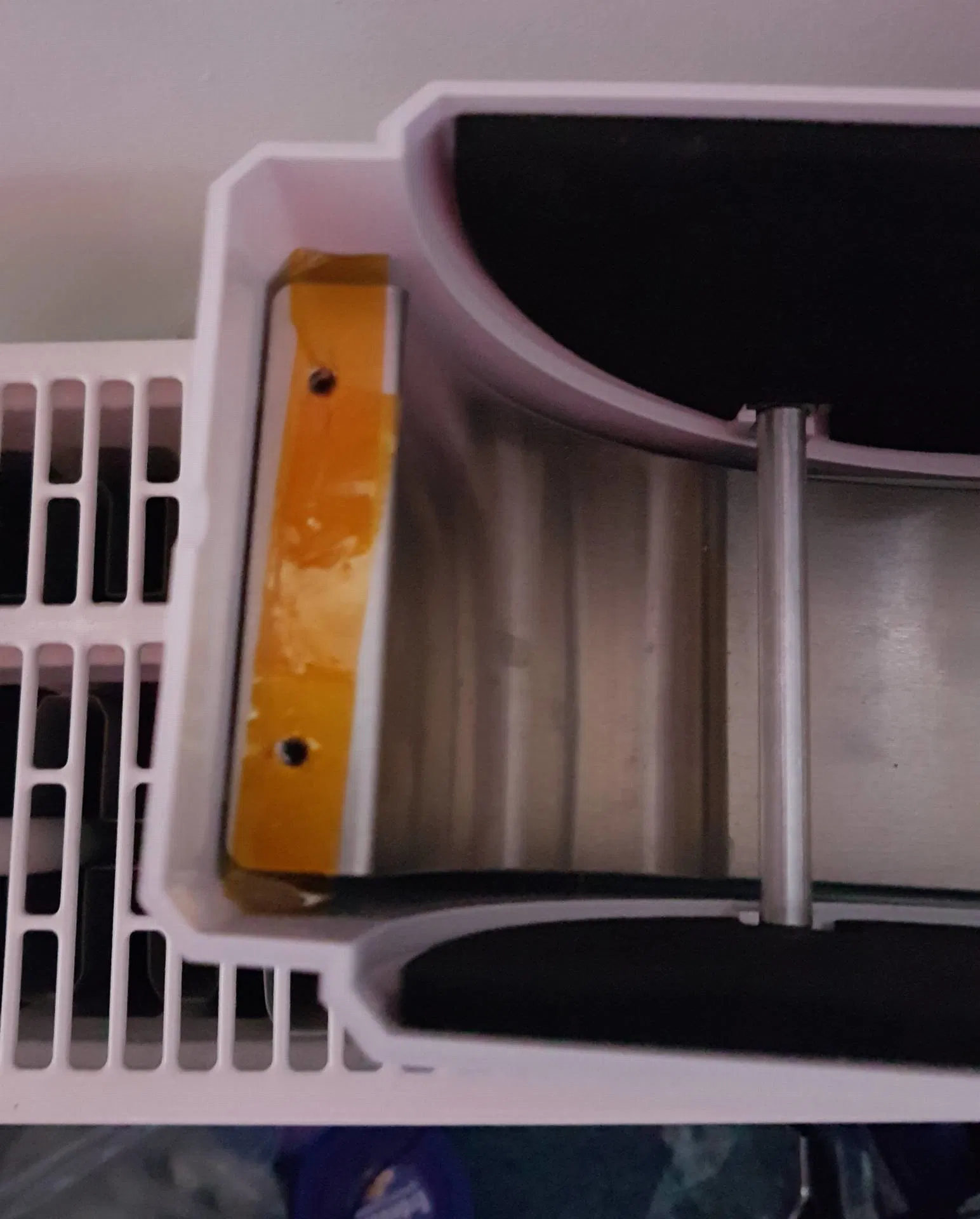 Đế gắn Sunlu được cố định bằng các ốc vít của bộ phận kim loại làm nóng (có thêm một dải băng Kapton để cách nhiệt một chút (mặc dù PET(G) cũng có thể hoạt động tốt mà không cần)). Máy sấy eSun (eBox) không có các ốc vít như vậy, nhưng có một khe mỏng có thể dùng để chèn một "lưỡi dao".