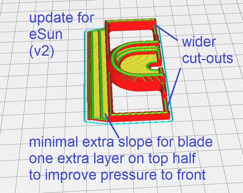 Cập nhật 2023-02-02: Một bản cập nhật rất nhỏ nữa cho đế gắn eBox vì tôi thấy có những cuộn sợi lớn hơn nữa gần như bị cọ xát. Tôi đã mở rộng các rãnh cắt một chút (bây giờ đến thành bên) và thêm một độ dốc tối thiểu vào lưỡi dao (kết quả là chỉ thêm một lớp trên nửa trên nếu in với lớp 0.2mm) để tăng nhẹ áp lực lên mặt trước.