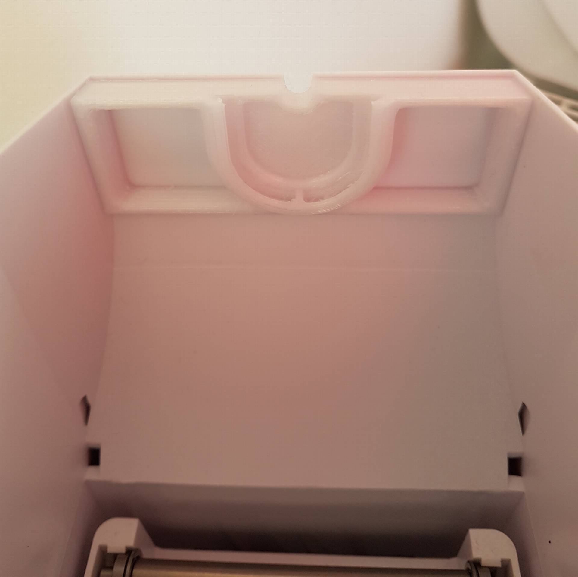 Giá đỡ đồng hồ được nghiêng vài độ để dễ dàng mở nắp. Và cánh tay để gắn nó vào đế gắn có một khoảng trống ở dưới đủ rộng cho sợi nhựa đi qua. Như vậy, đồng hồ đo độ ẩm có thể được gắn hoặc tháo ra bất cứ lúc nào, ngay cả trong quá trình in. Điều này đặc biệt hữu ích cho phiên bản eBox, vì không gian hạn chế dưới nắp tròn, các cuộn sợi nhựa đầy có thể không cho phép gắn đồng hồ ngay lập tức.
