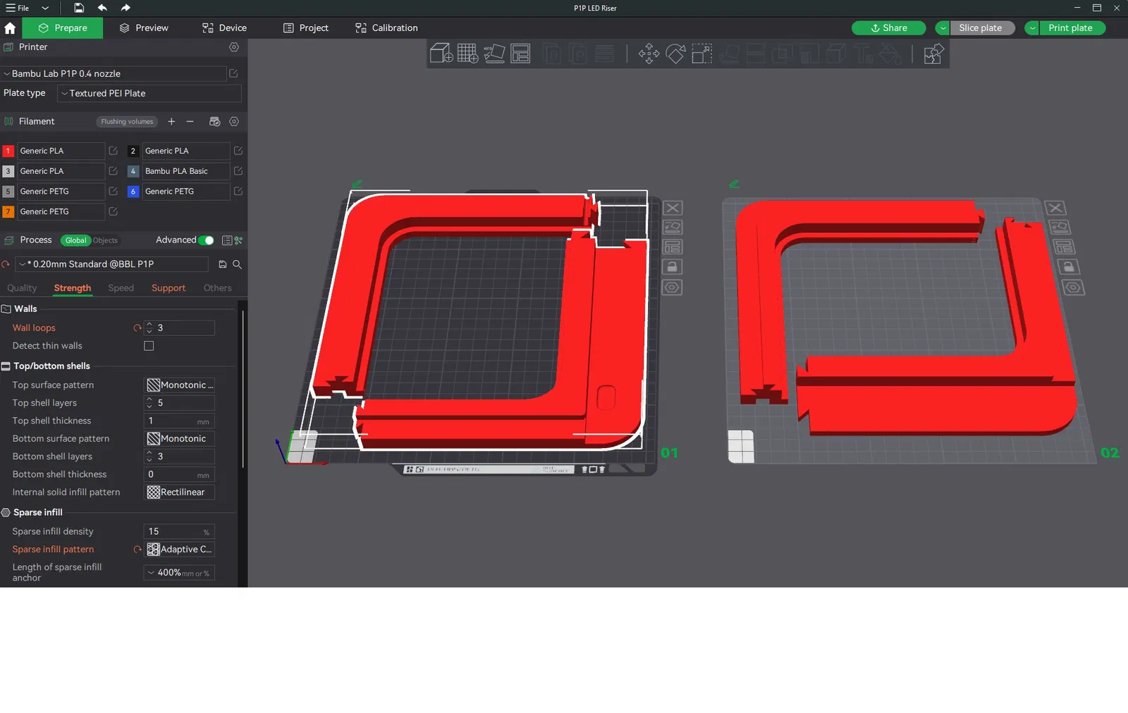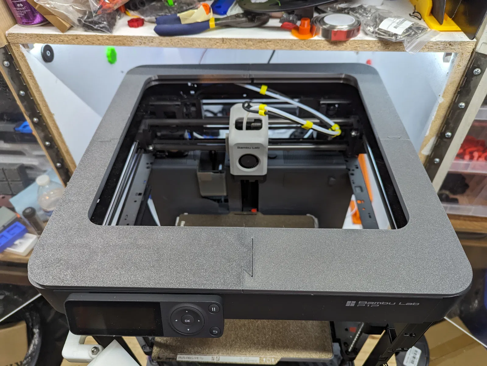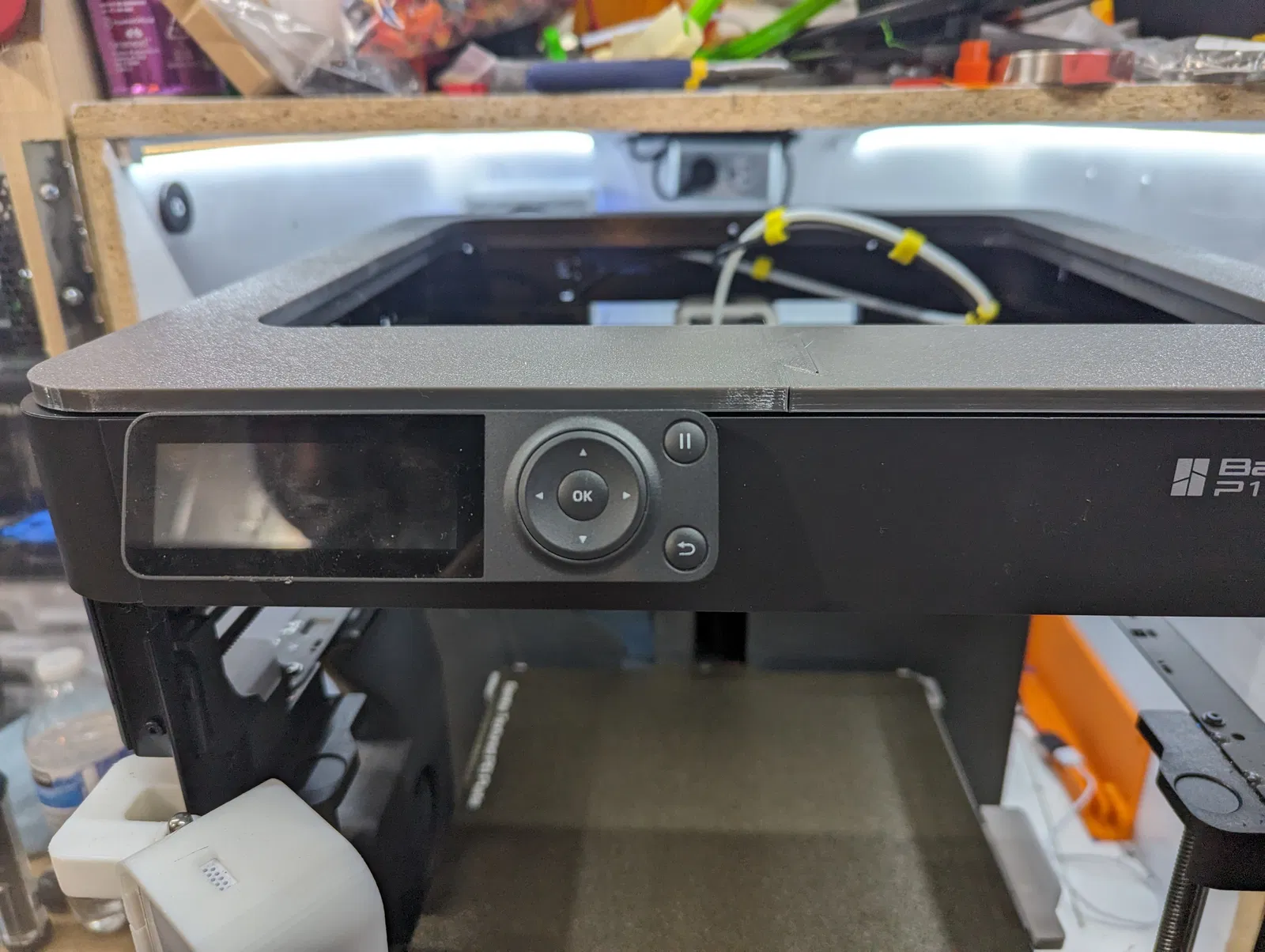 Sau khi làm cái giá đỡ/lỗ thông hơi cho P1S của mình, tôi nghĩ là có thể cắt nó ra để làm chỗ gắn đèn LED cho P1P. Hóa ra nó không dễ dàng như vậy, vì phần trên của P1P khác với P1S vì nó không cần giữ nắp. Sau khi chỉnh sửa lại phần cắt, tôi cắt ngắn nó xuống và làm lại các khớp nối. Bây giờ nó chỉ đơn giản là một cái giữ dải đèn LED. Nó được làm cho dải đèn LED neon như thế này https://www.amazon.com/gp/product/B0BB724ZS9/ref=ppx_yo_dt_b_asin_title_o00_s00?ie=UTF8&th=1 nhưng có thể nó sẽ hoạt động với các dải đèn LED khác. Bất kỳ loại băng dính hai mặt mỏng nào cũng nên dùng được; tôi đã dùng băng keo siêu dính dày ½ inch.