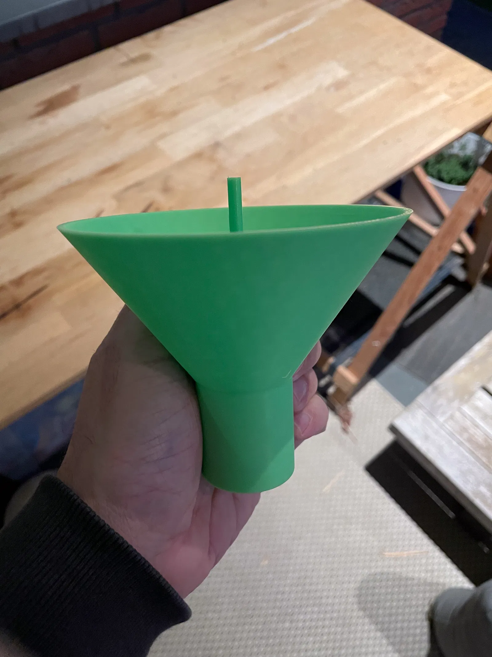 Cái này là cái phễu để đổ chất lỏng vô chai, có kênh khí để tránh bị nghẽn khi in. Mặt trên rộng 600, in không cần support.