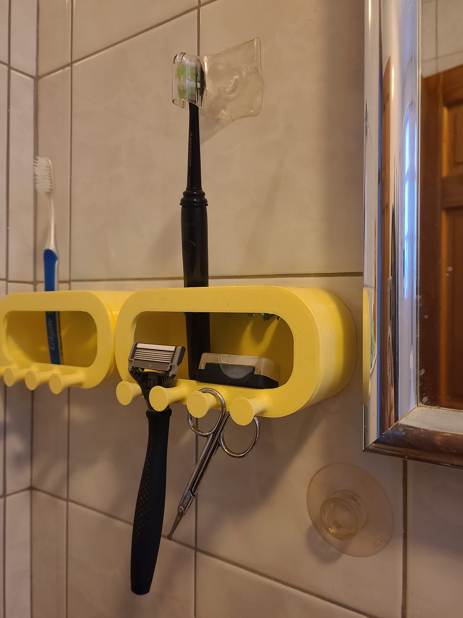 Giá đỡ bàn chải đánh răng đa năng này có móc tích hợp để treo dao cạo, giúp tiết kiệm không gian và sắp xếp phòng tắm của bạn. Được thiết kế để in 3D, bao gồm đế, nắp và hướng dẫn in. Khuyến khích in hướng dẫn bằng TPU hoặc vật liệu mềm khác để có sự linh hoạt.