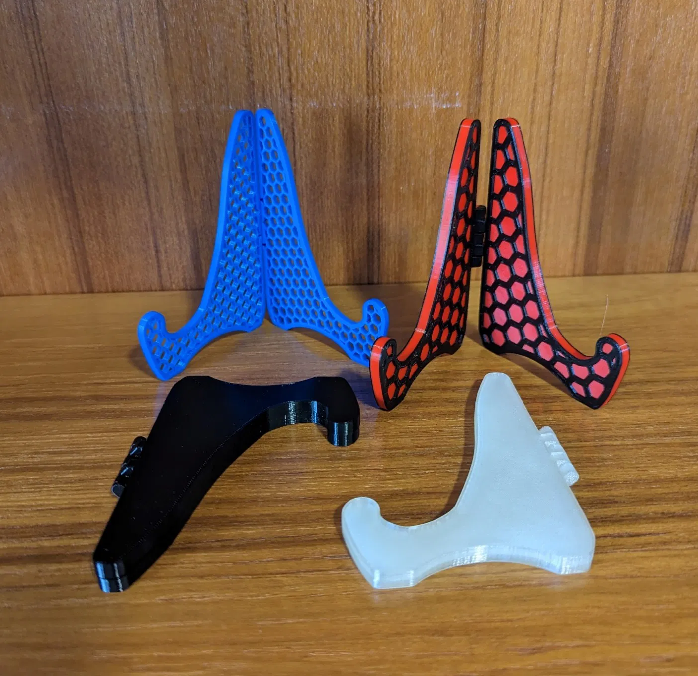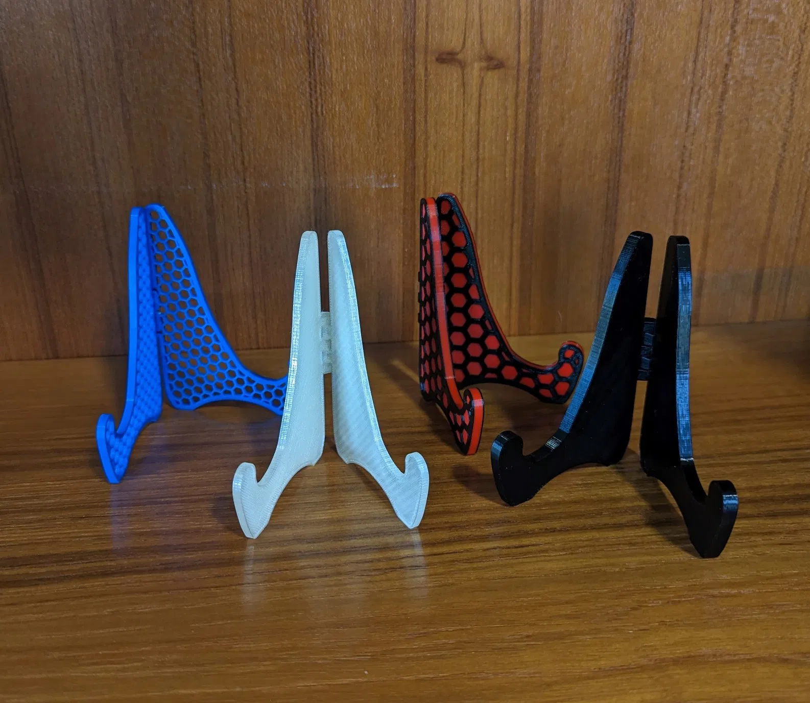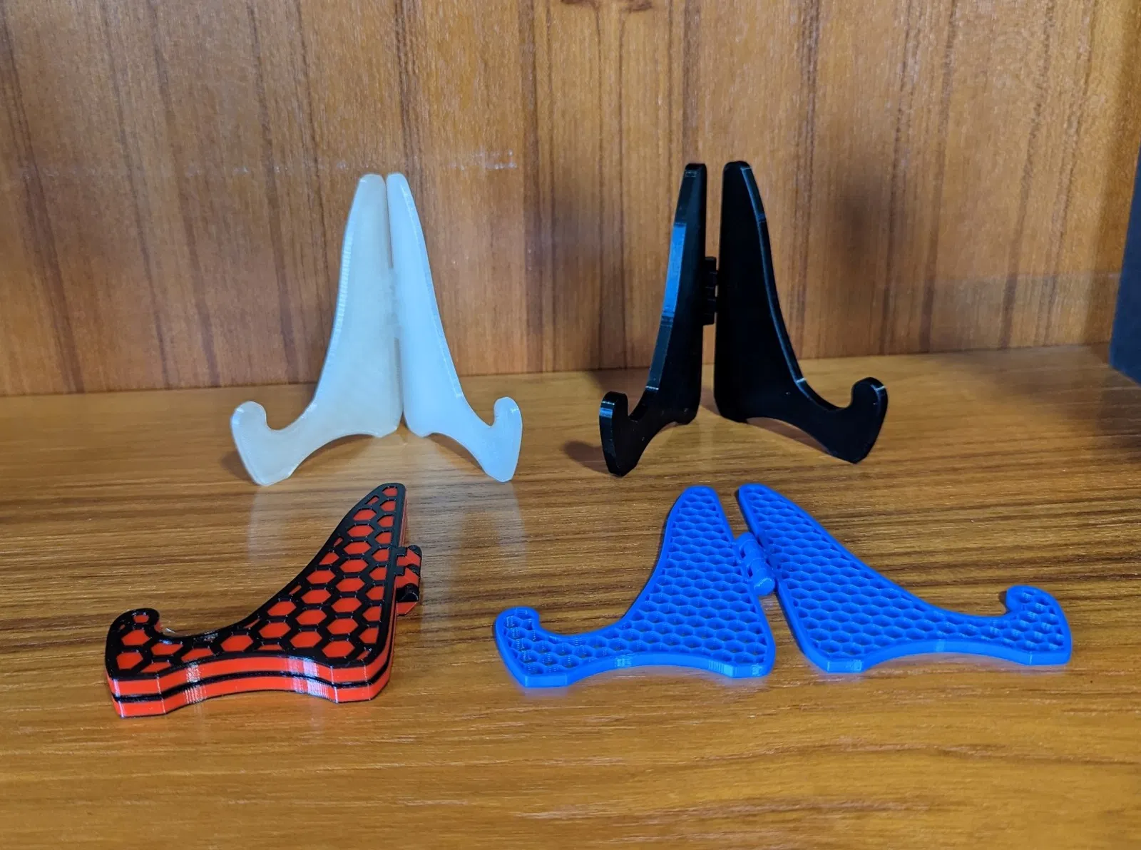 Các file bao gồm giá đỡ màn hình đặc, một mẫu mỏng hơn, và một mẫu có hoa văn tổ ong 2 mặt rất hợp để đổi màu. Các giá đỡ có thể gập phẳng đôi lại khi không sử dụng.