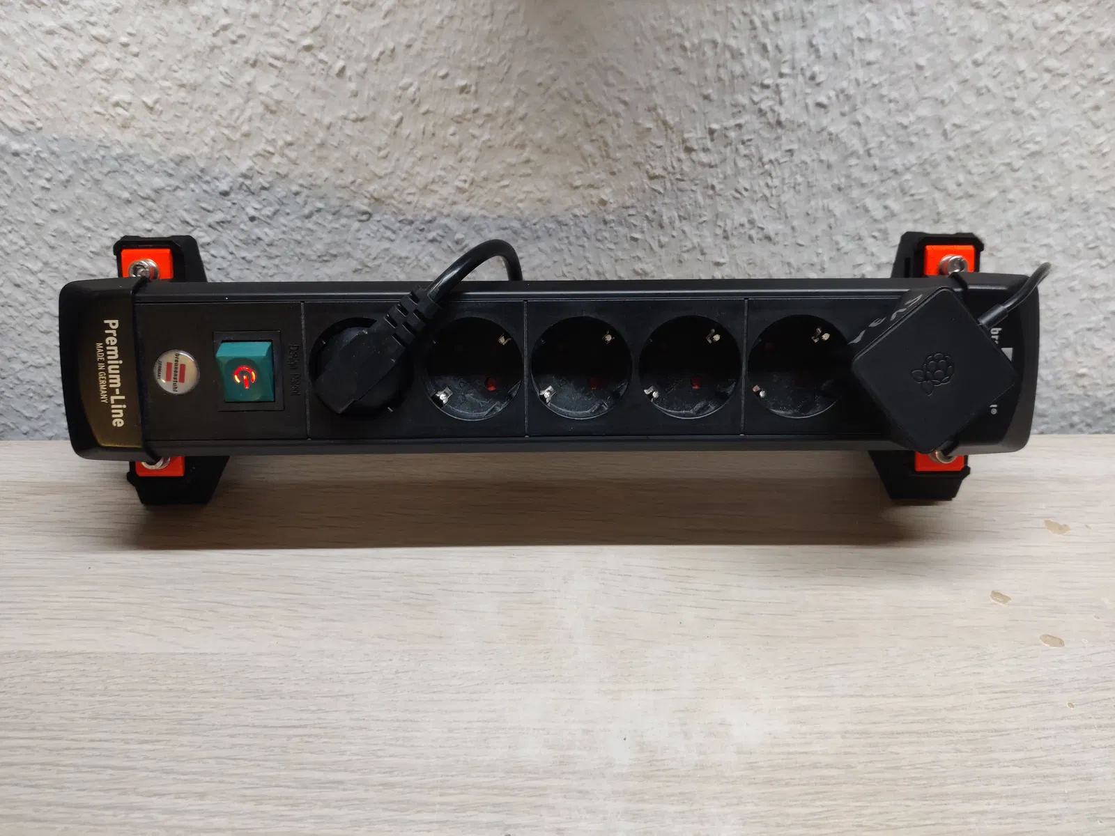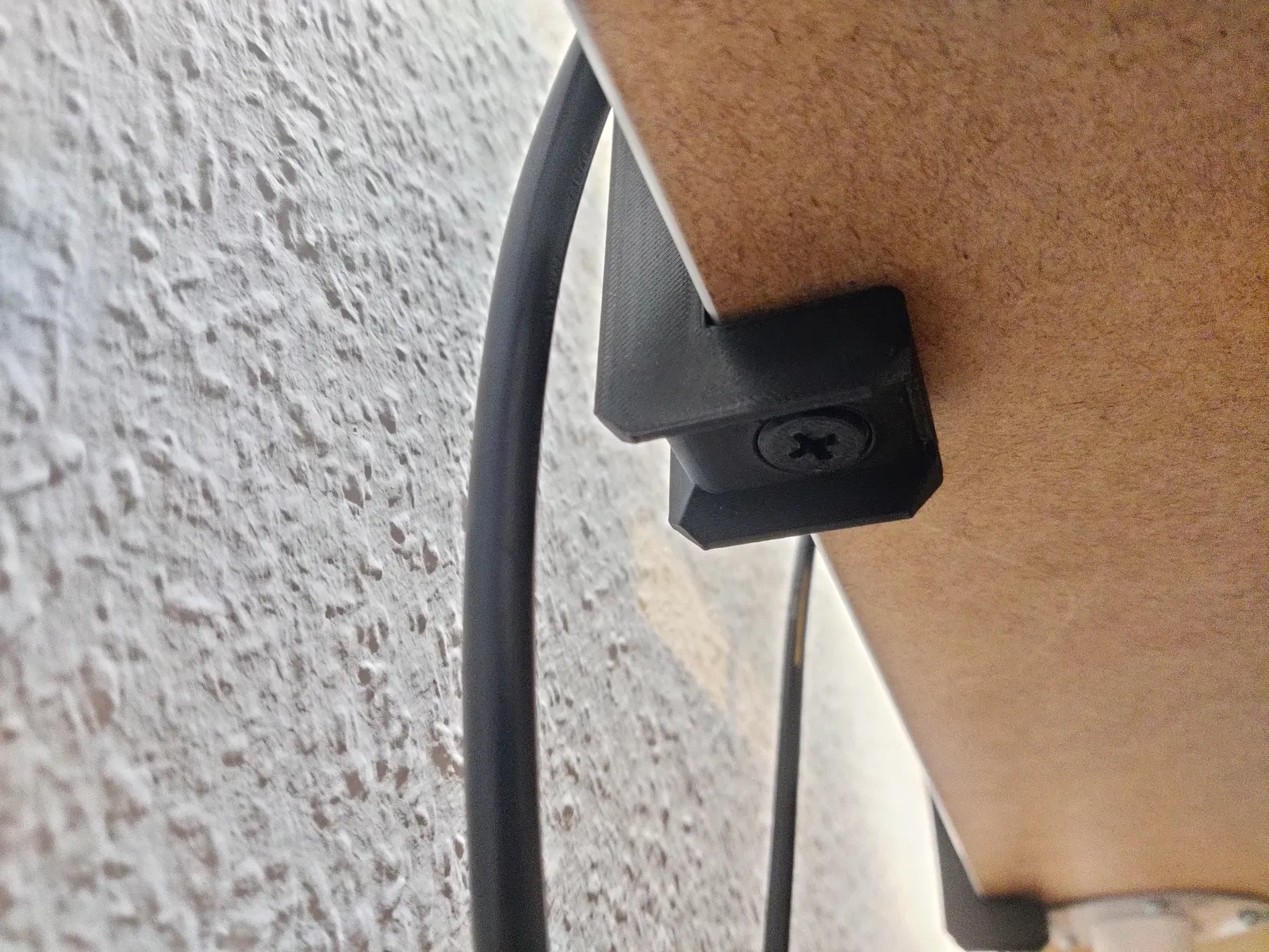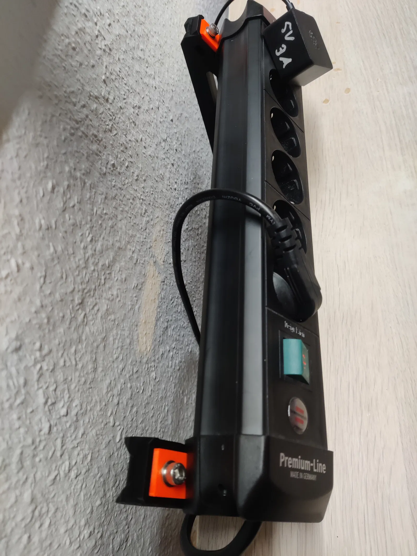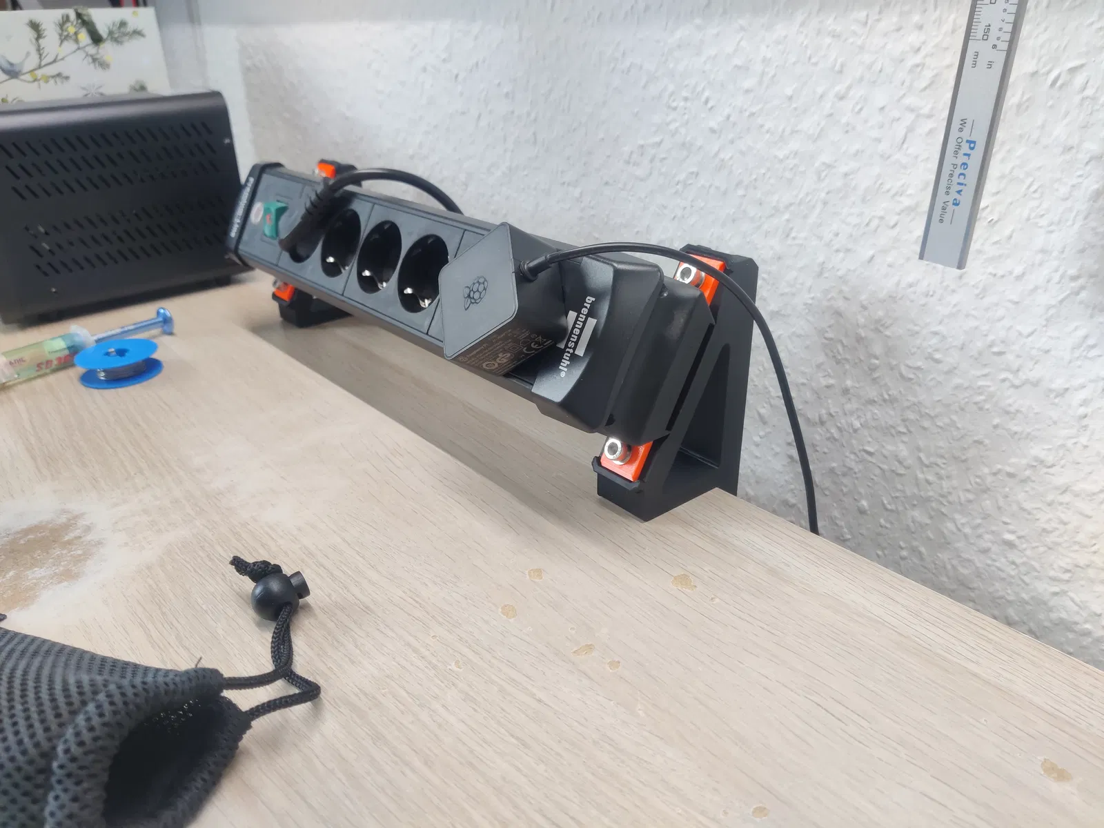 Giá đỡ để kẹp ổ cắm điện Brennestuhl vào bàn làm việc của bạn. Sử dụng ốc lục giác in 3D để siết chặt vào mặt bàn, dùng mũi PH2 để vặn cẩn thận và tránh siết quá chặt. Cố định ổ cắm điện bằng 4 vít M6x16, bu lông và vòng đệm.