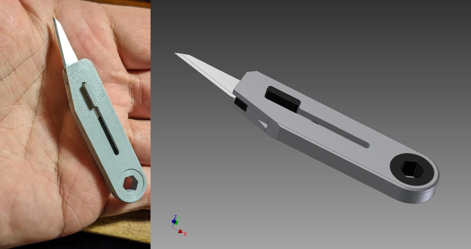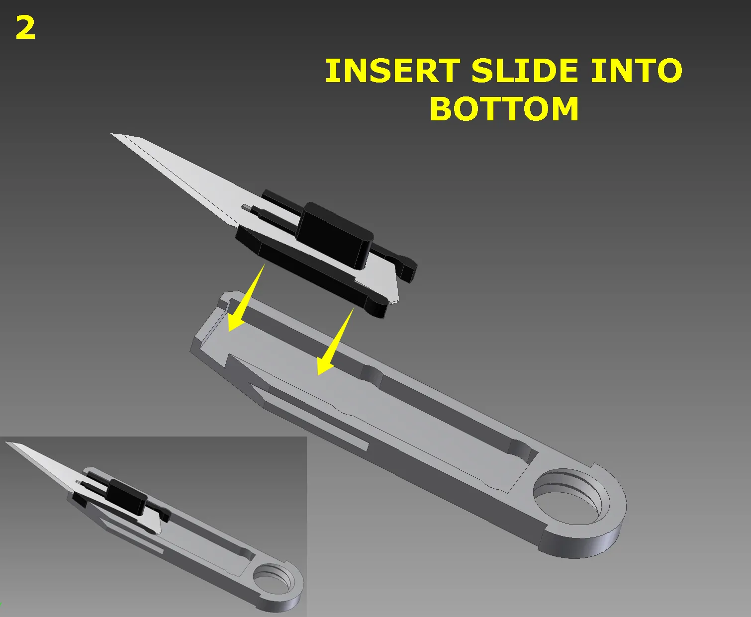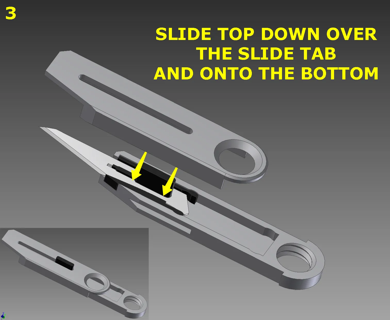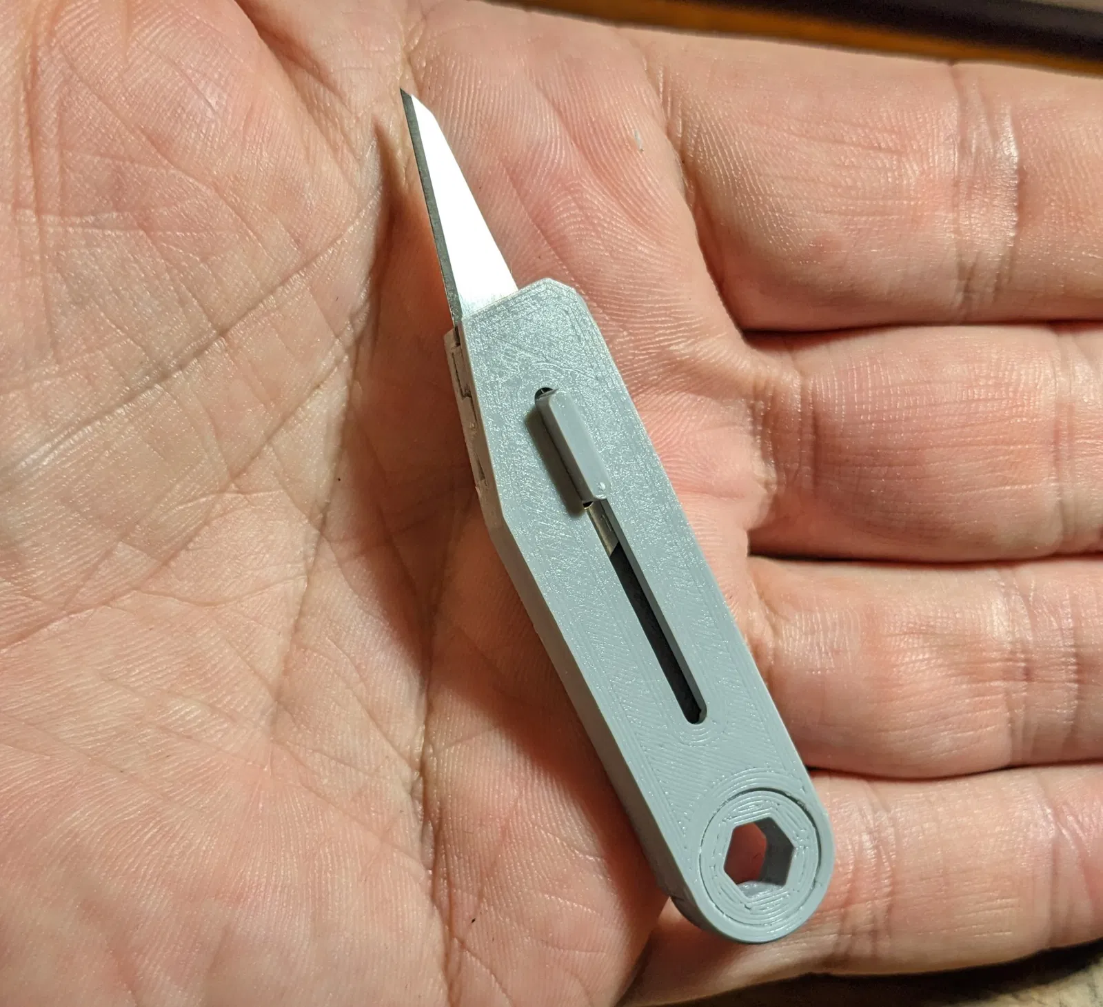 Dao cắt túi có thể thu vào được thiết kế cho lưỡi dao #11. Không cần hỗ trợ. Không cần phần cứng. Khuyến nghị in ở độ dày 0.1mm hoặc 0.08mm khi sử dụng vòi phun 0.4mm. Được thiết kế với độ chính xác chặt chẽ để giúp giữ nó ở vị trí đóng. Tôi khuyên bạn nên sử dụng một chút graphit để bôi trơn thanh trượt. Ngày 22 tháng 6: Đã thêm một nắp bảo vệ, bao gồm một phiên bản có kẹp, để an toàn hơn khi mang trong túi. Kẹp có độ chính xác chặt chẽ có thể yêu cầu phải tách ra khỏi thân. Nó nên tách ra với áp lực tối thiểu. Ngày 14 tháng 8: Đã thêm các cạnh vát để khắc phục các vấn đề về khoảng cách chân voi. Phiên bản phù hợp với lưỡi dao loại #11 XACTO có sẵn tại đây: <>