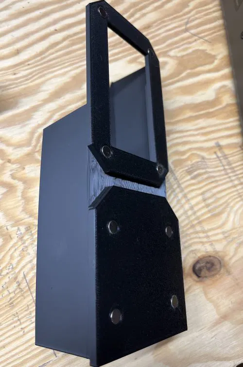 Tôi cũng đã tạo một giá đỡ được bắt vít vào máng bằng cách thay thế hai ốc vít bằng M3x8mm BHCS. Giá đỡ này giúp căn chỉnh thùng với máng. Nếu sử dụng giá đỡ, sẽ có thêm một miếng đệm được dán siêu dính vào mặt sau của thùng để nó áp sát vào mặt sau của máy in.