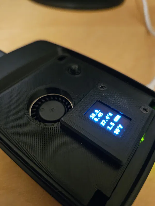 Mô hình này giới thiệu bộ phận chèn cho case Pi 5 chính hãng, bao gồm tản nhiệt chủ động, camera nhỏ và màn hình. Nắp case gốc vẫn vừa vặn, cho phép bạn giấu các bộ phận khi cần. Người dùng chủ yếu sử dụng màn hình để kiểm tra địa chỉ IP của Pi.