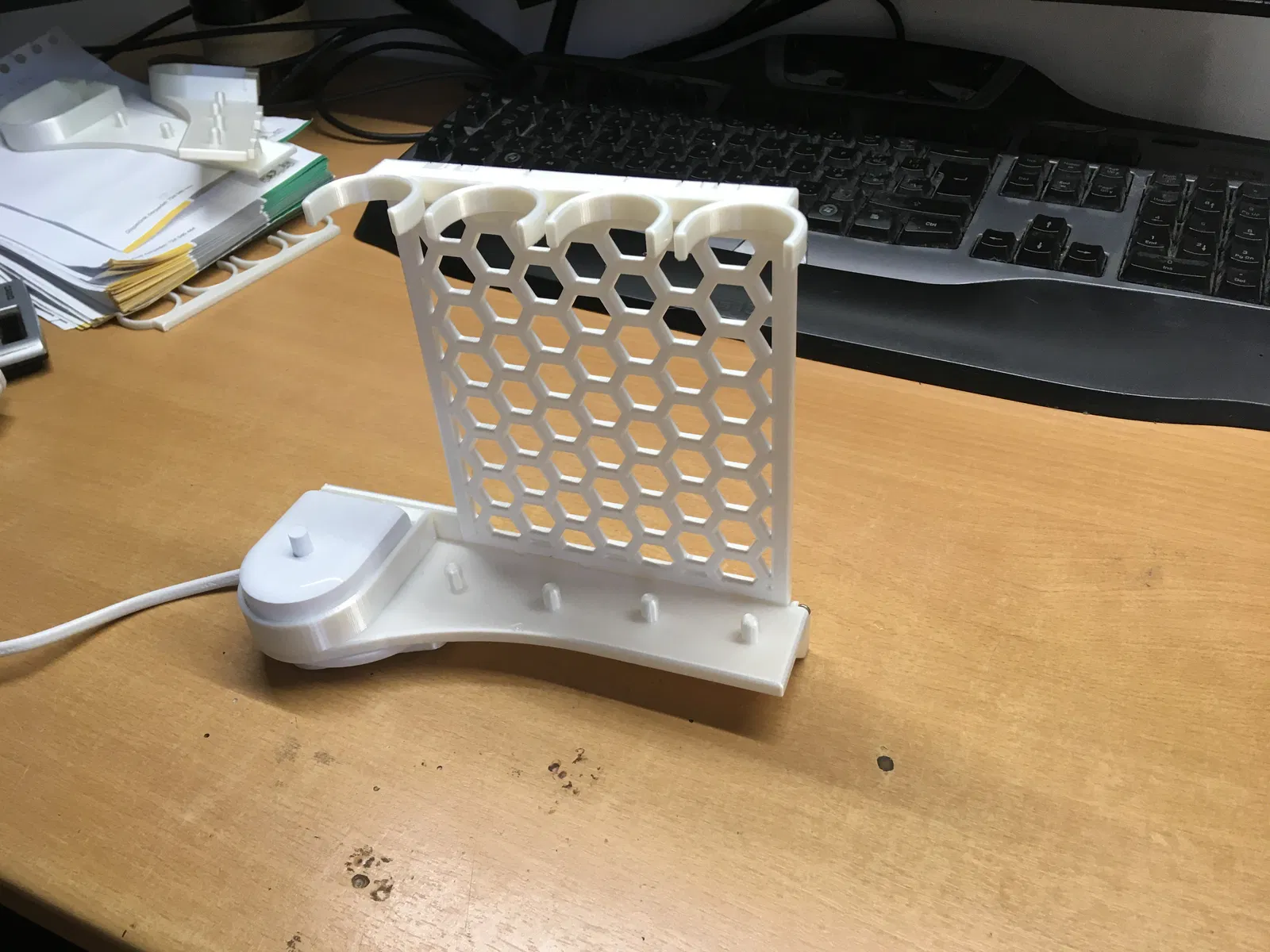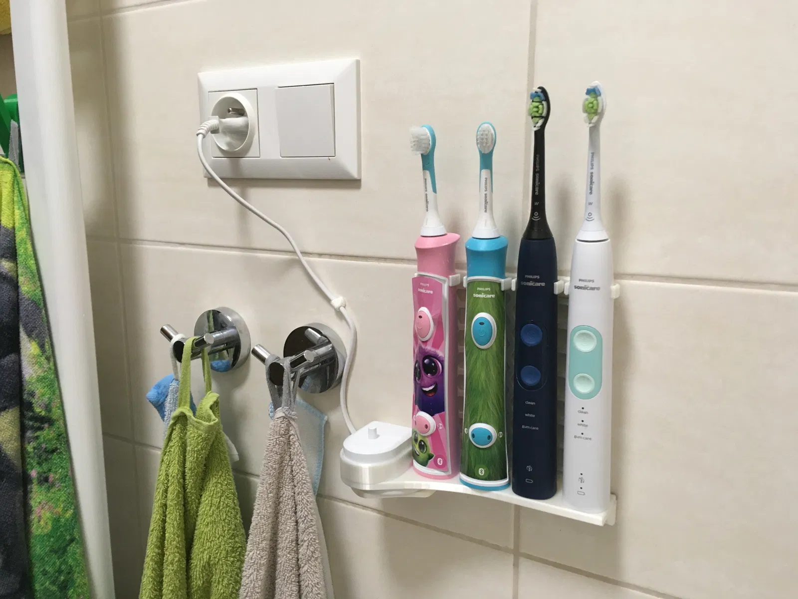 Giá đỡ bàn chải đánh răng cho 2 bàn chải người lớn và 2 bàn chải trẻ em, kèm theo đế sạc. Sản phẩm được thiết kế để giữ gọn gàng bàn chải và dây sạc, dễ dàng lắp đặt và tháo gỡ.