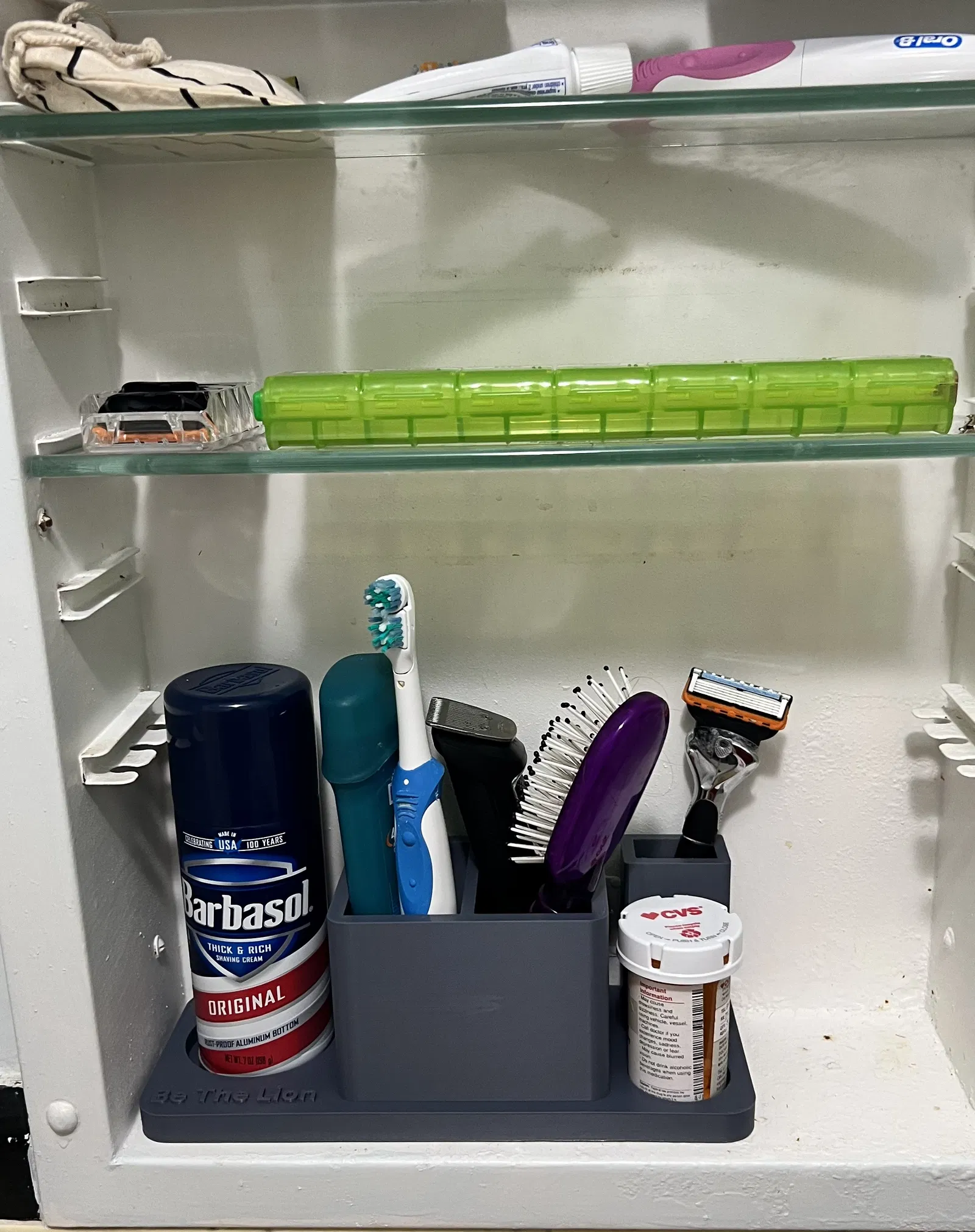 Kệ tổ chức tủ thuốc đơn giản bao gồm khay đựng kem cạo râu, 2 hộc đựng đồ đa năng, chỗ cắm bàn chải đánh răng và hộc đựng thuốc. Đặc biệt, kệ còn có thông điệp "Hãy là sư tử" để khích lệ bạn luôn là phiên bản tốt nhất của chính mình.