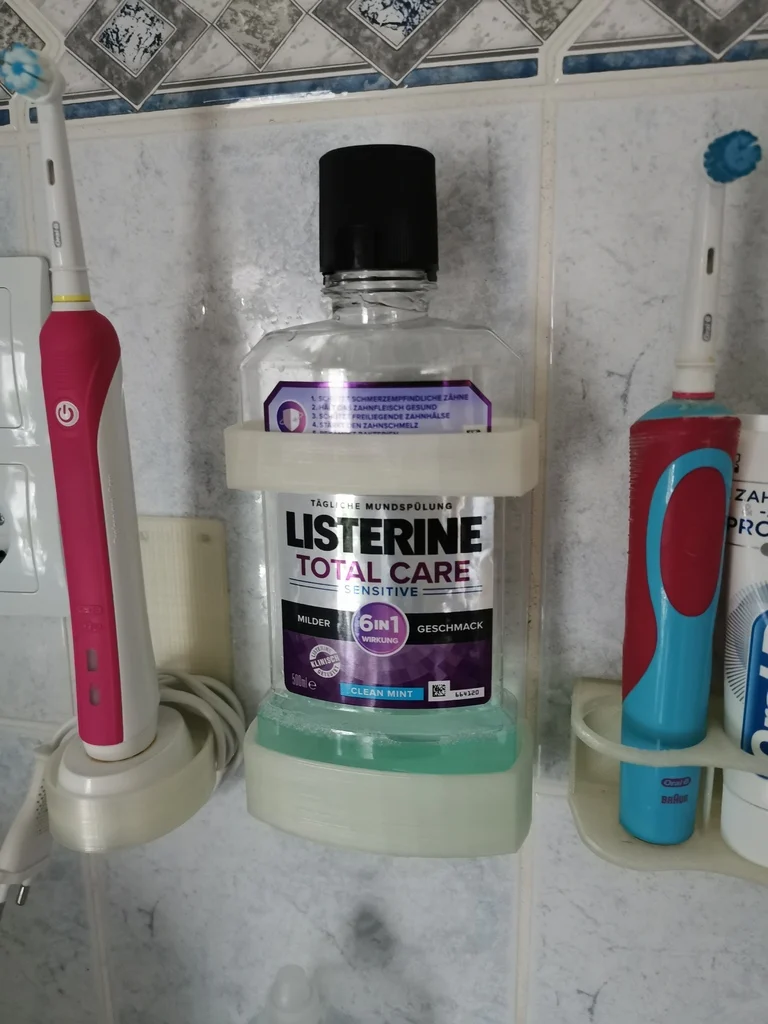 Chiếc giá đỡ/kẹp này được thiết kế để giữ bình Listerine của bạn một cách gọn gàng. Hoàn hảo cho phòng tắm hoặc bất kỳ không gian nào bạn muốn giữ mọi thứ ngăn nắp. Dễ dàng in ấn với PLA.