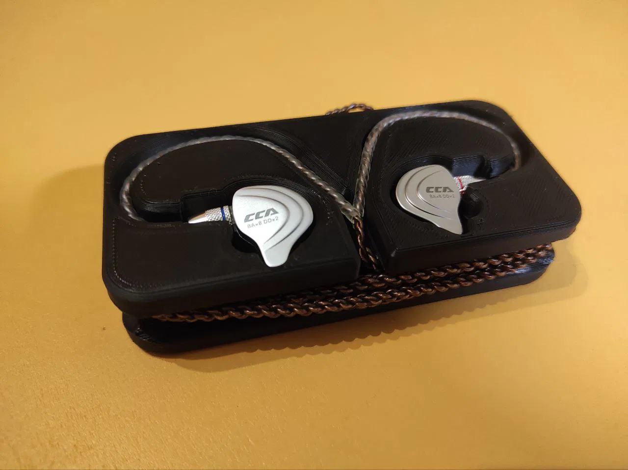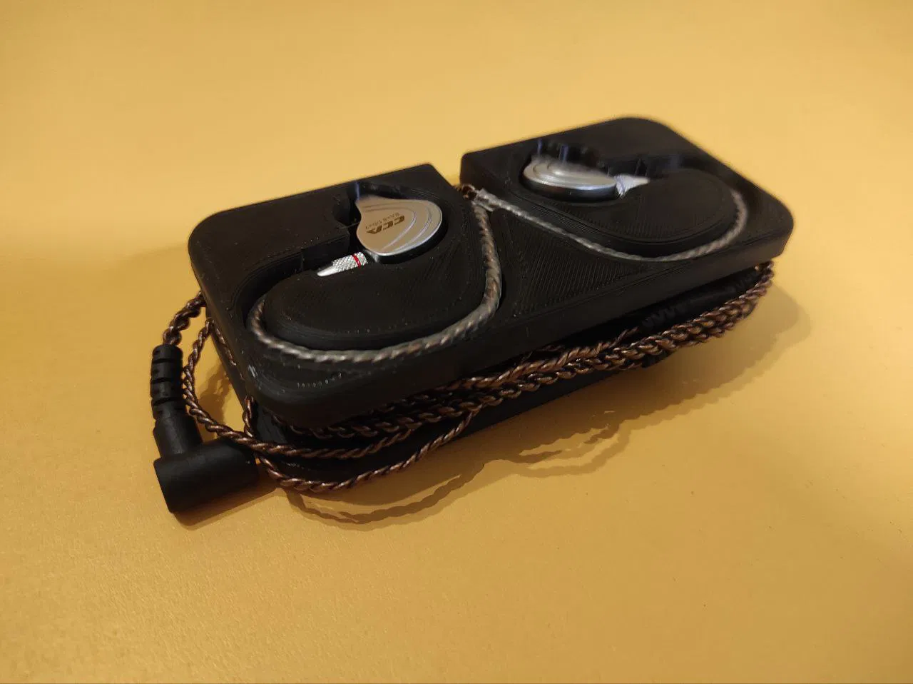 Một cái case để giữ cho dây tai nghe của mình khỏi bị rối. Mô hình này chưa được hoàn hảo lắm. Như bạn thấy trong hình, mình đã khoét một lỗ nhỏ ở cạnh bên để cắm jack 3.5mm vào, giúp dây cáp được cố định khi quấn lại. Lấy cảm hứng từ , nhưng CCA C10 có dây cáp khác nên tai nghe của mình không vừa với mô hình đó.