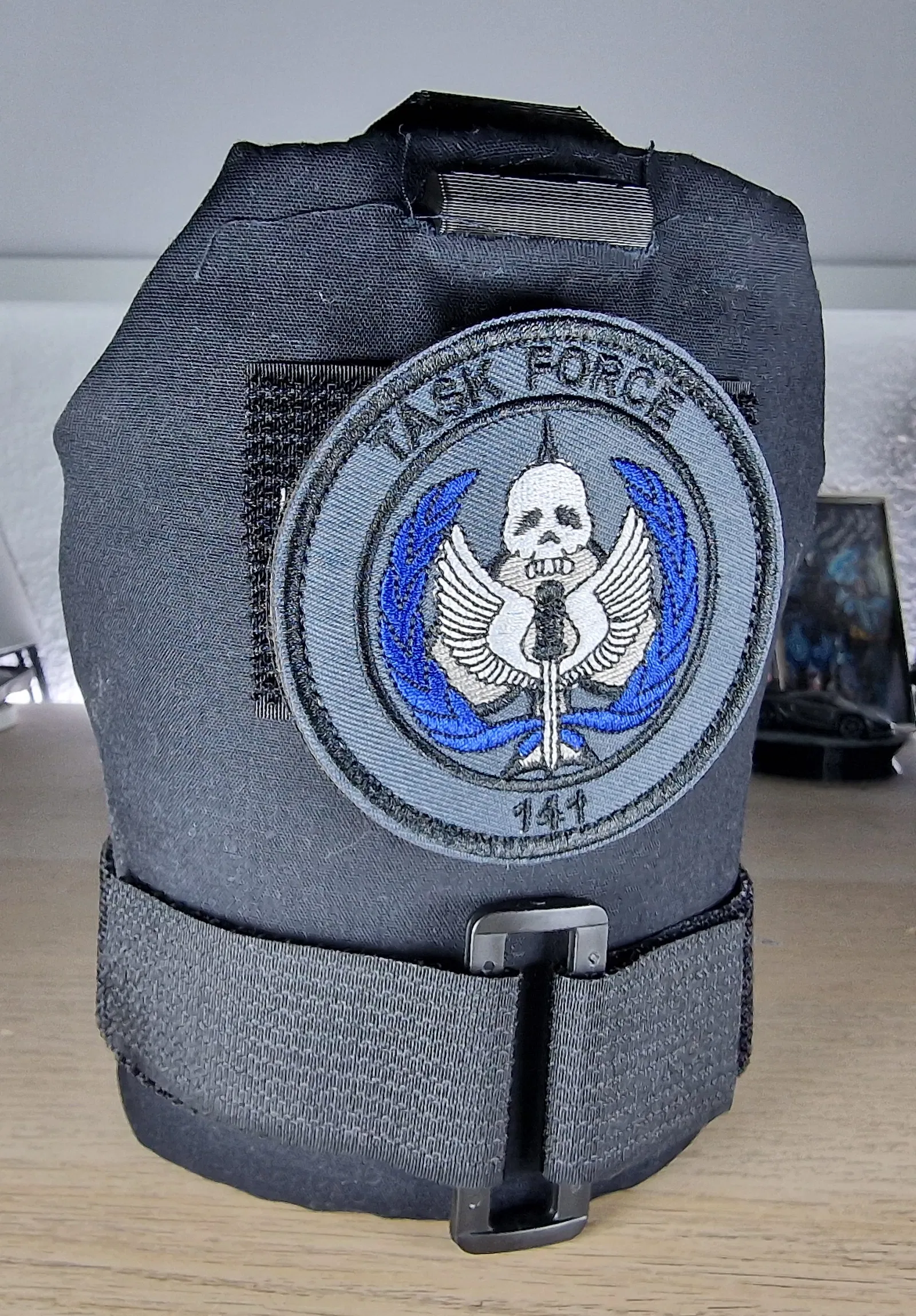 Tôi đã quấn vải xung quanh và thêm dây đeo velcro để gắn các miếng dán. Người có chút tài năng hơn có thể làm cho nó trông giống bản gốc hơn với các chi tiết cắt kiểu molle và nói chung là đẹp hơn.