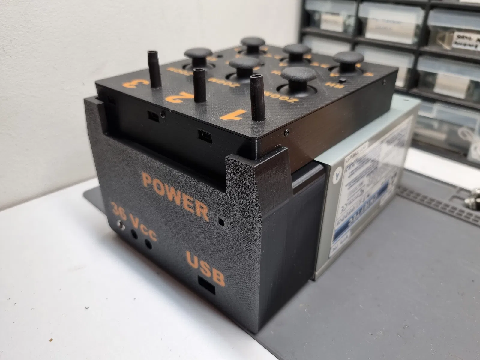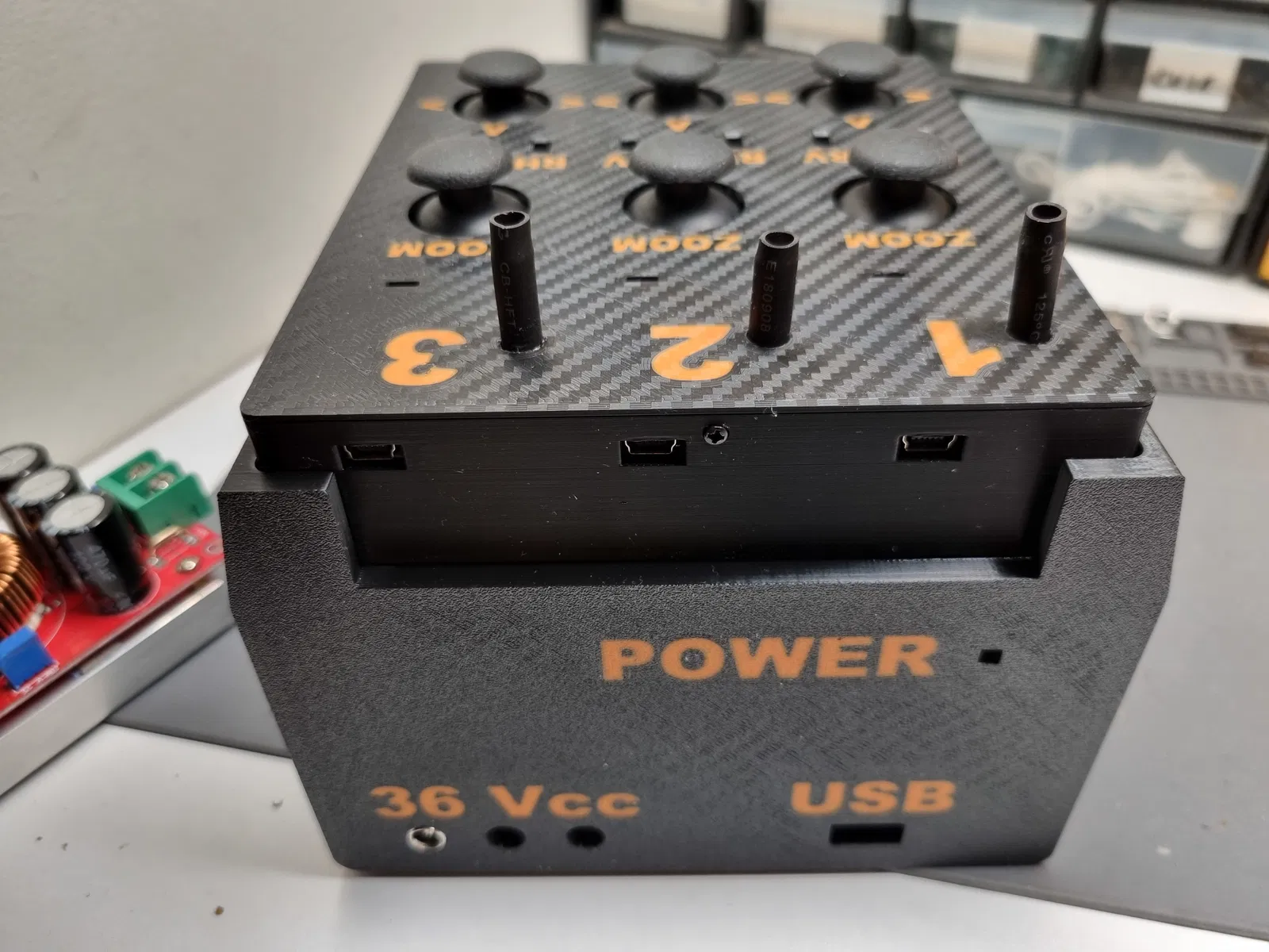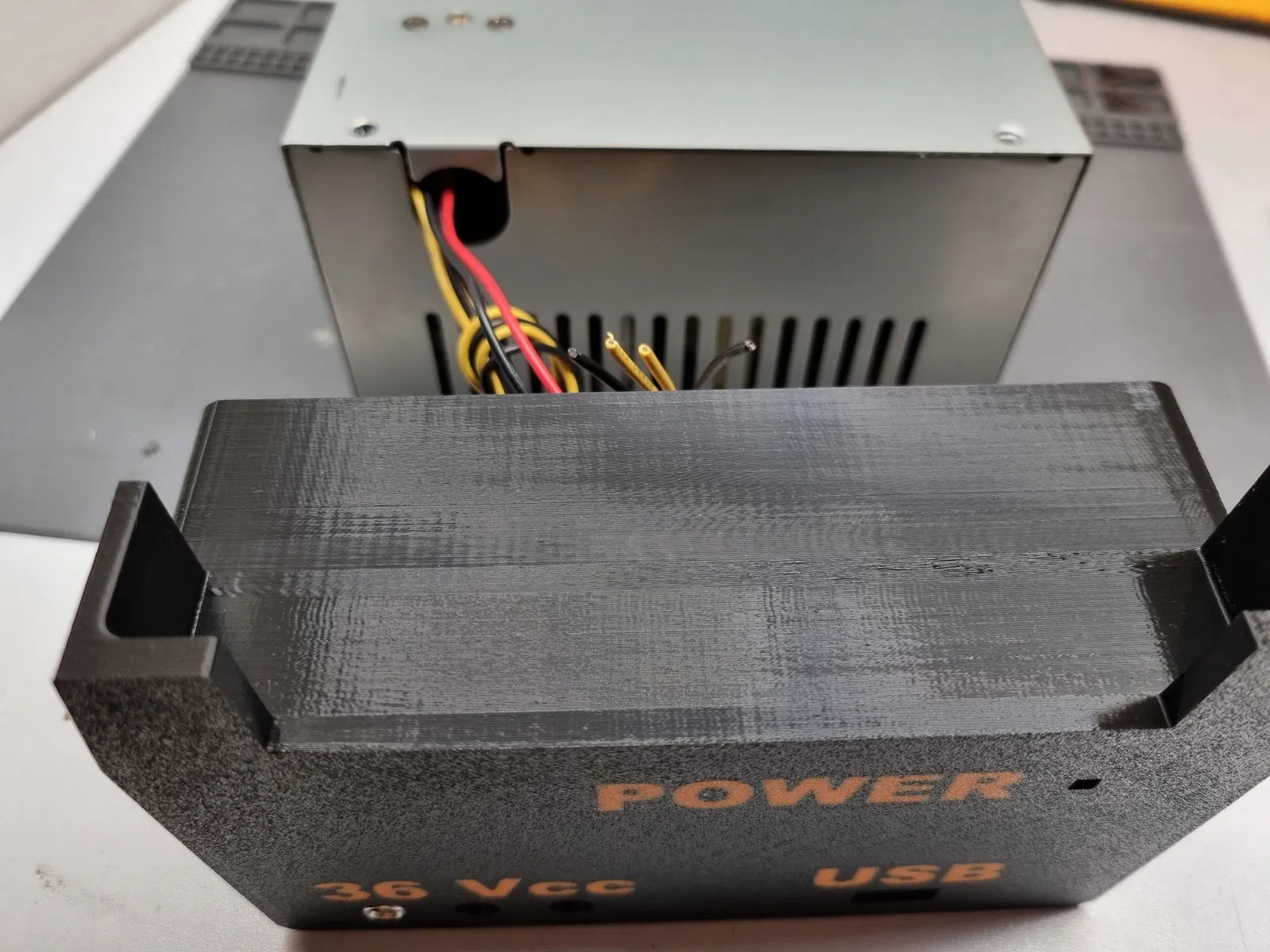 Tao cần một cách để gắn thêm bộ chuyển đổi tăng áp 1200W. Tao chế tạo một cơ cấu pan-tilt zoom đòi hỏi nguồn điện qua khoảng cách xa bằng dây mỏng nên 12V không đủ. 36V là mức thấp nhất mà tao làm cho nó hoạt động được. Nên tao lấy một bộ ATX PSU cũ, gỡ bỏ mấy cái dây không cần thiết và chỉ giữ lại 12V với 5V. Cái 12V tao nối vào Vcc in còn cái 5V thì nối vào cổng USB.