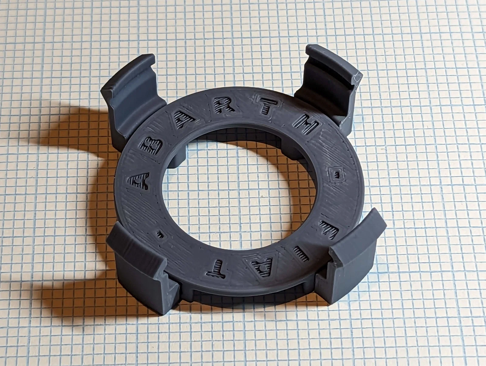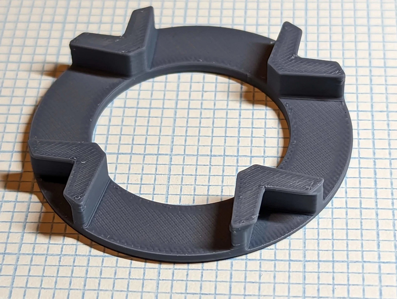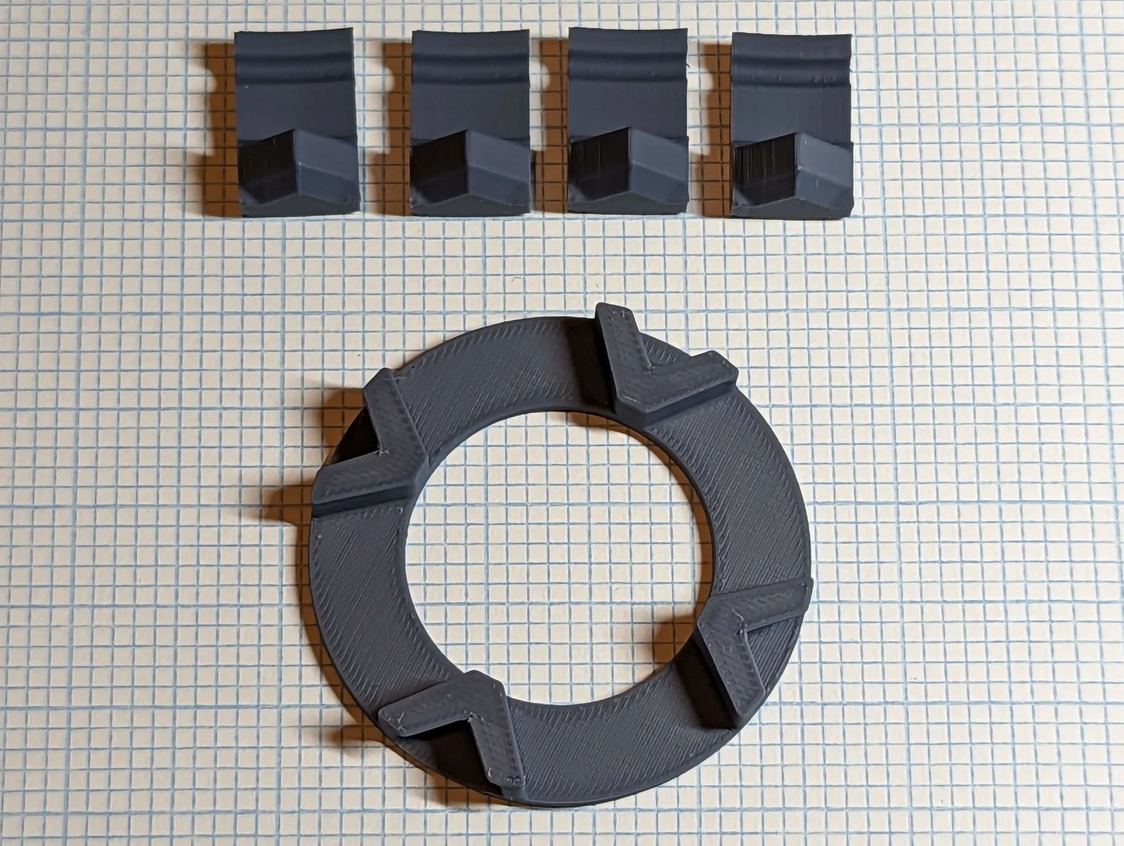 Lý tưởng nhất là in bằng ABS và dùng keo dung môi để dán lượng lẫy cần thiết vô cái vòng, rồi dán cả cụm vô mặt sau của nắp mâm luôn. Đổ keo lên đỉnh mỗi phần tam giác, cộng thêm mấy bên hông nữa, rồi phủ lên mấy cái mặt phẳng ở giữa để đảm bảo dán chắc chắn.