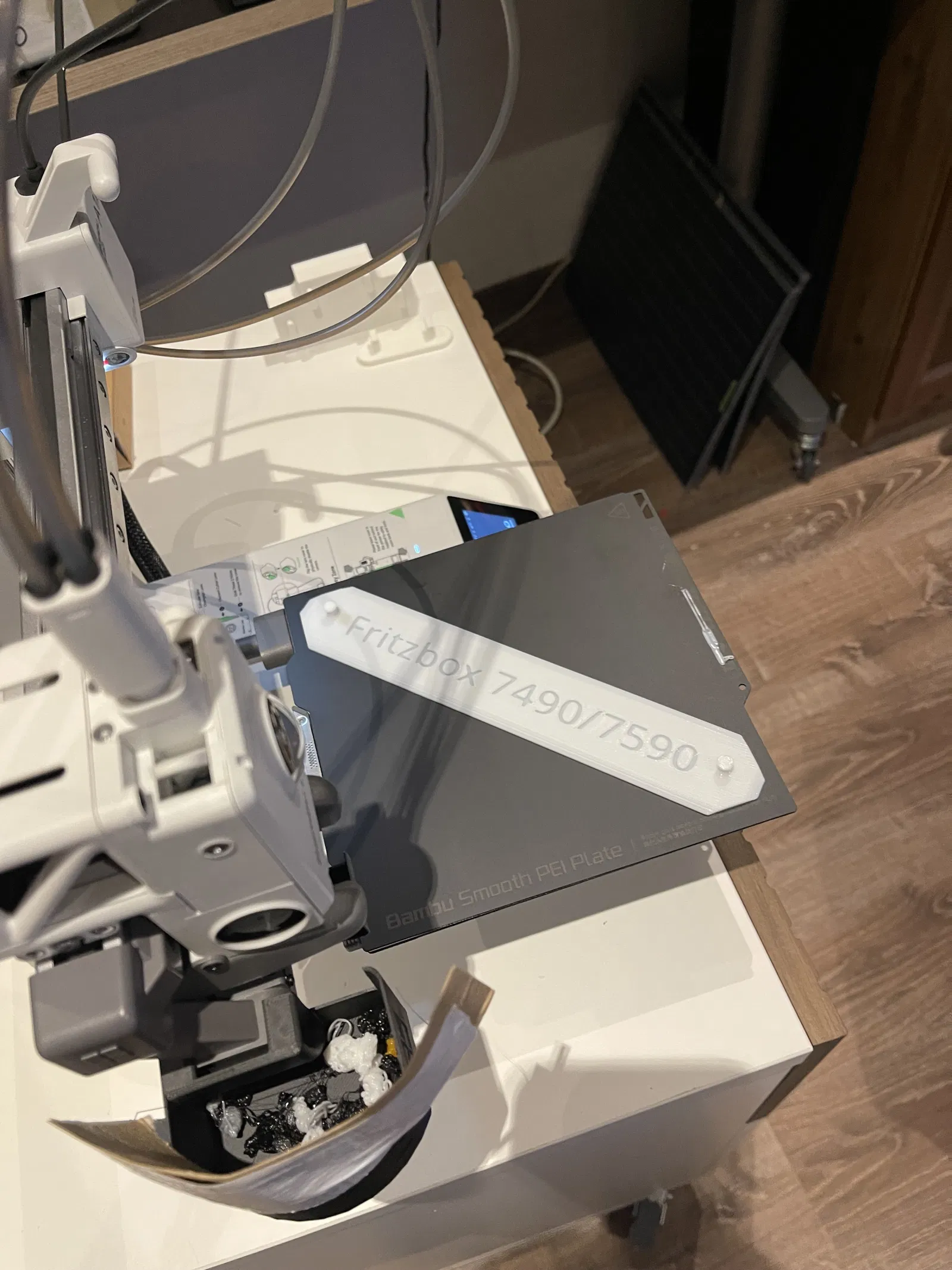 Một bản phối lại "quick'n'dirty" của giá treo tường FritzBox với tấm nền phẳng để dán băng keo hai mặt.