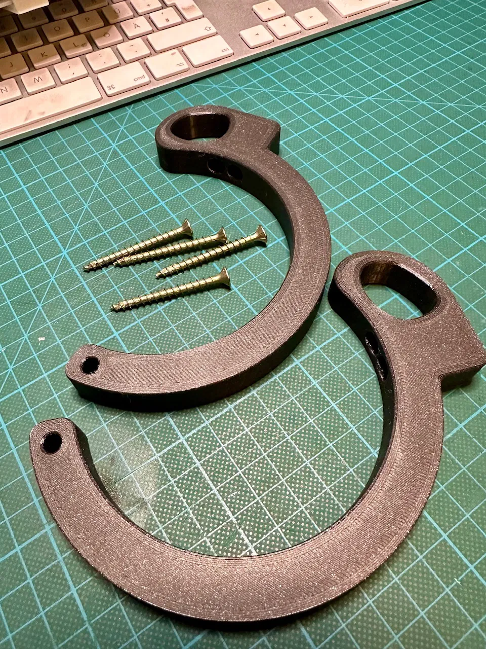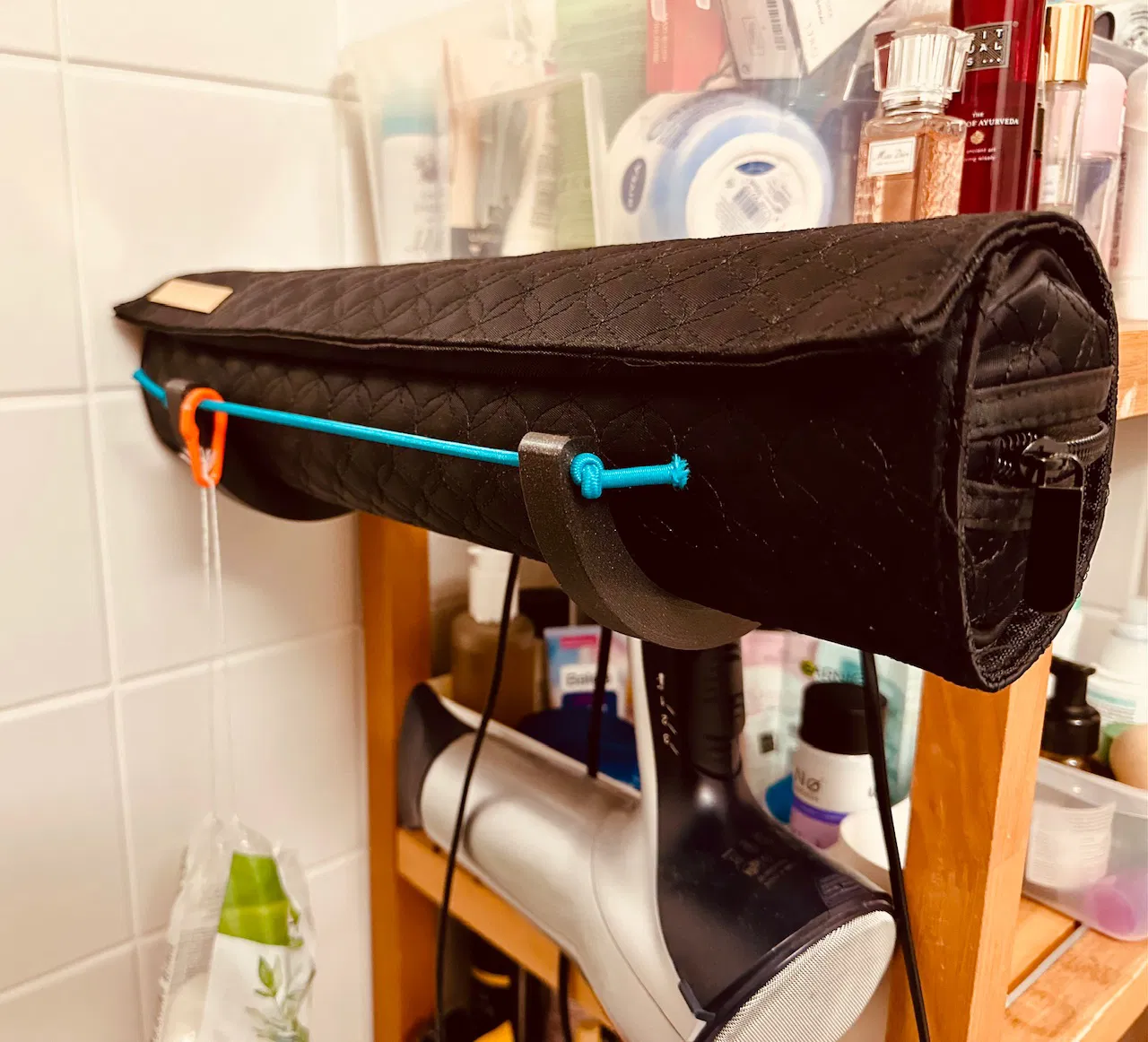 Giá đỡ / Móc để bắt vít cho HOT TOOLS PROFESSIONAL BLACK GOLD EVOLVE trong hộp đựng. Sản phẩm được làm từ nhựa PETG, với các cài đặt in chi tiết như nhiệt độ bàn in 90°C và nhiệt độ đầu phun 250°C, cùng với 10% Gyroid Infill. Đây là một phụ kiện tiện lợi, giúp bạn lưu trữ máy sấy tóc một cách gọn gàng và an toàn.