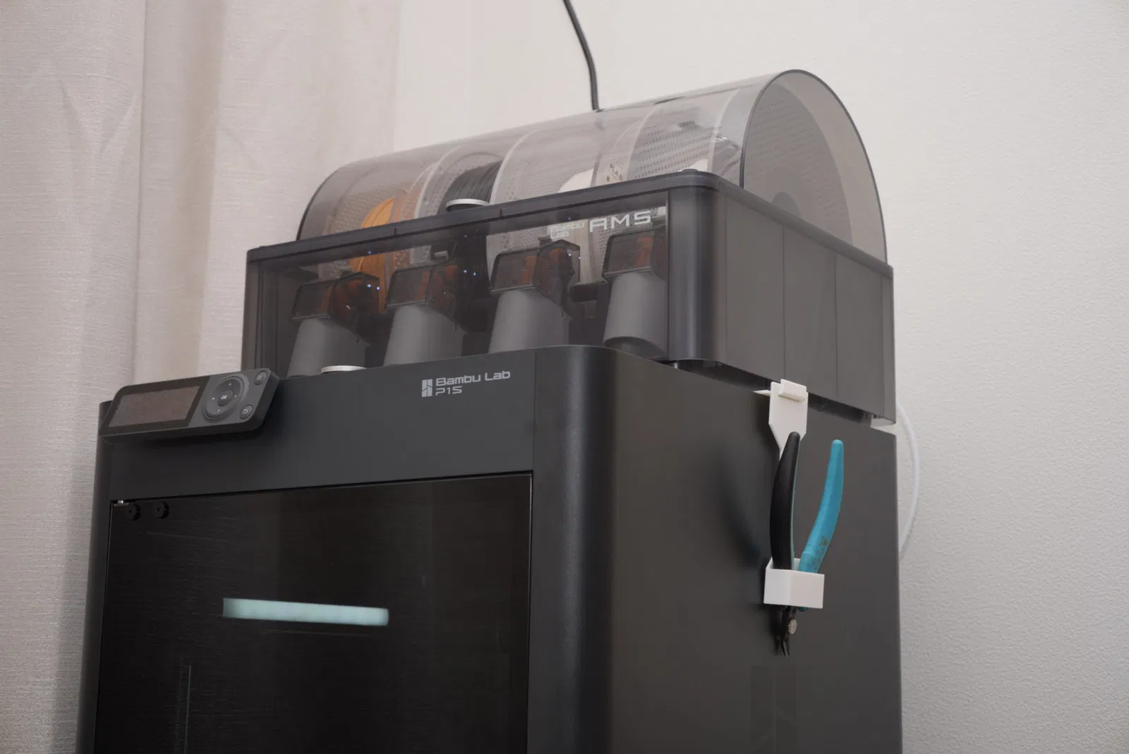Cái giá treo đồ này được nhét vào khe hở giữa máy Bambu Lab P1S và bộ AMS.