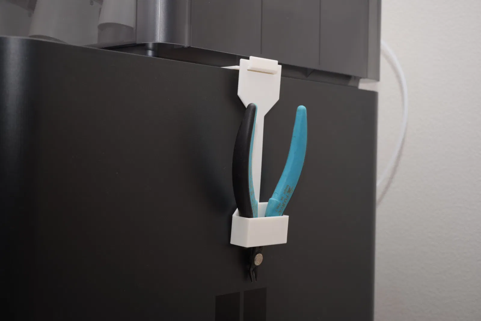 Giá treo dụng cụ này nhét vừa vào khe giữa máy Bambu Lab P1S và bộ AMS, cho phép bạn treo các vật dụng như kìm cắt, thước kẹp và dễ dàng tháo lắp mà không cần bắt vít hay băng keo.