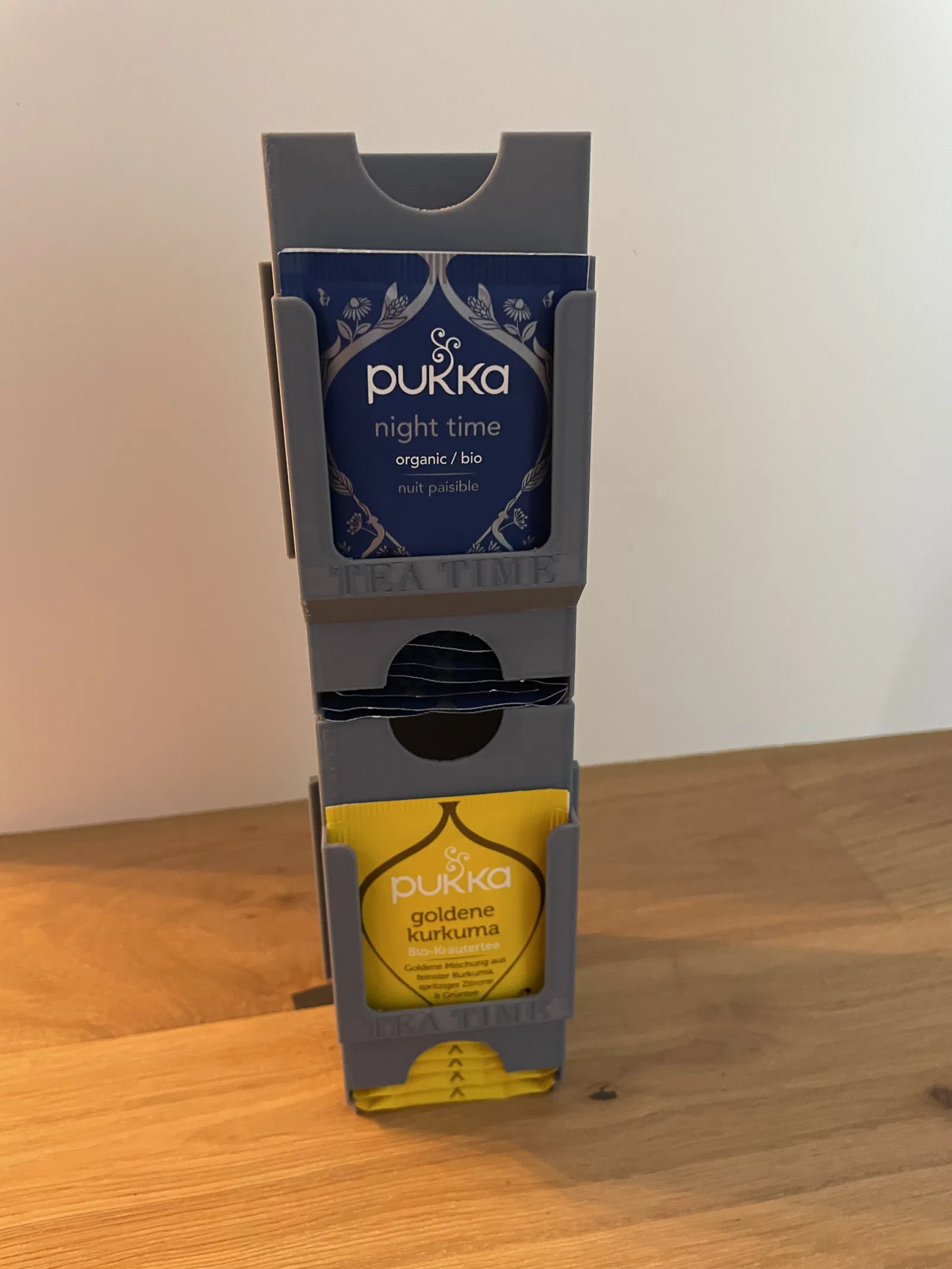 Thiết kế lại hộp đựng trà Teabox để chứa được các loại túi trà lớn hơn, có ray ghép nối và xếp chồng tiện lợi. Hướng dẫn in chi tiết với PETG, độ cao lớp 0.16mm và supports. Có file Fusion 360 cho phép chỉnh sửa.