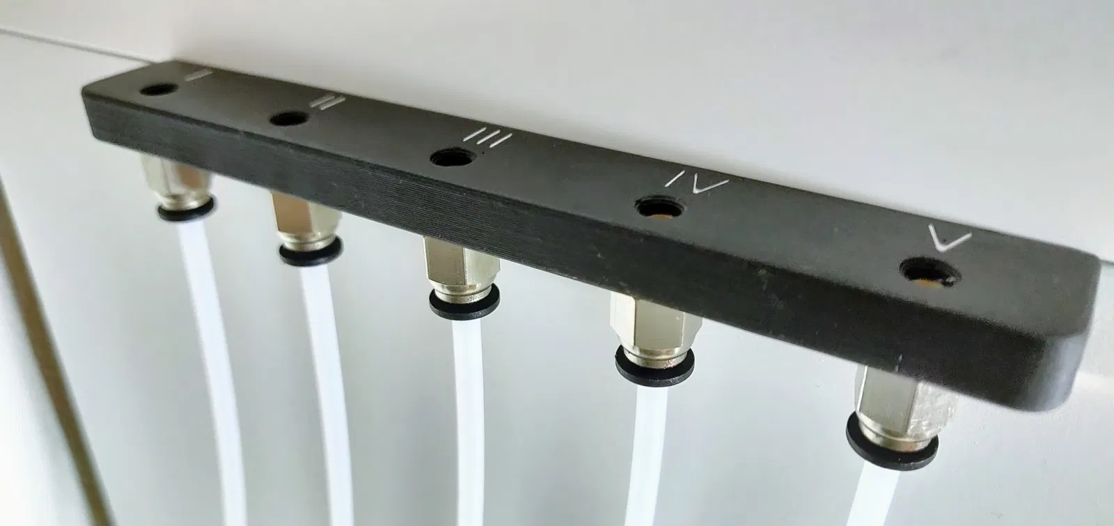 Trong hình là kết quả cuối cùng cũng như các bước đã thực hiện. Đầu tiên, mình chà nhám phần này với giấy P600, sau đó mình đánh bóng nó bằng Dremel. Mình dùng ống nối khí nén PC4-M6 và vặn chúng vào. Cuối cùng, mình gắn nó bằng vài con ốc Ikea còn dư lên kệ Ikea của mình.